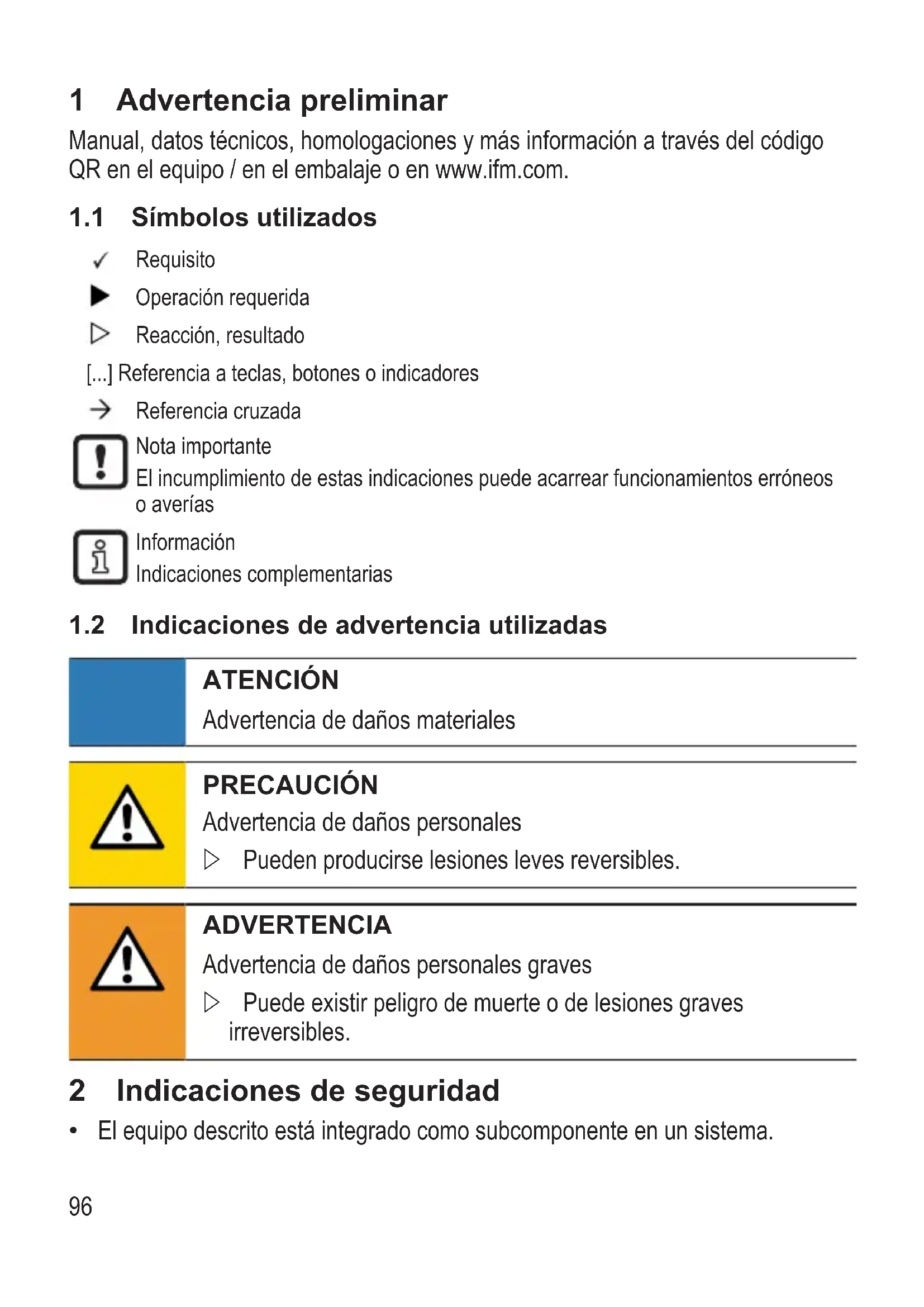 - 16 Mantenimiento, reparación y eliminación 6 1 Advertencia preliminar Manual, datos técnicos, homologaciones y más información a través del código QR en el equipo / en el embalaje o en www.ifm.com. 1.1 Símbolos utilizados Requisito Operación requerida Reacción, resultado [ ] Referencia a teclas, botones o indicadores Referencia cruzada Nota importante El incumplimiento de estas indicaciones puede acarrear funcionamientos erróneos o averías Información Indicaciones complementarias 1.2 Indicaciones de advertencia utilizadas ATENCIÓN Advertencia de daños materiales PRECAUCIÓN Advertencia de daños personales w Pueden producirse lesiones leves reversibles. ADVERTENCIA Advertencia de daños personales graves w Puede existir peligro de muerte o de lesiones graves irreversibles. 2 Indicaciones de seguridad p. 1149
