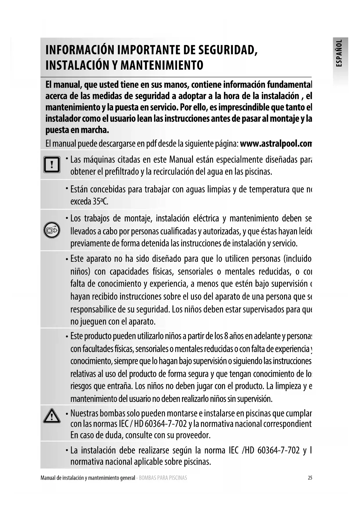 El manual, que usted tiene en sus manos, contiene información fundamental acerca de las medidas de seguridad a adoptar a la hora de la instalación , el mantenimiento y la puesta en servicio. Por ello, es imprescindible que tanto el instalador como el usuario lean las instrucciones antes de pasar al montaje y la puesta en marcha. El manual puede descargarse en pdf desde la siguiente página: www.astralpool.com