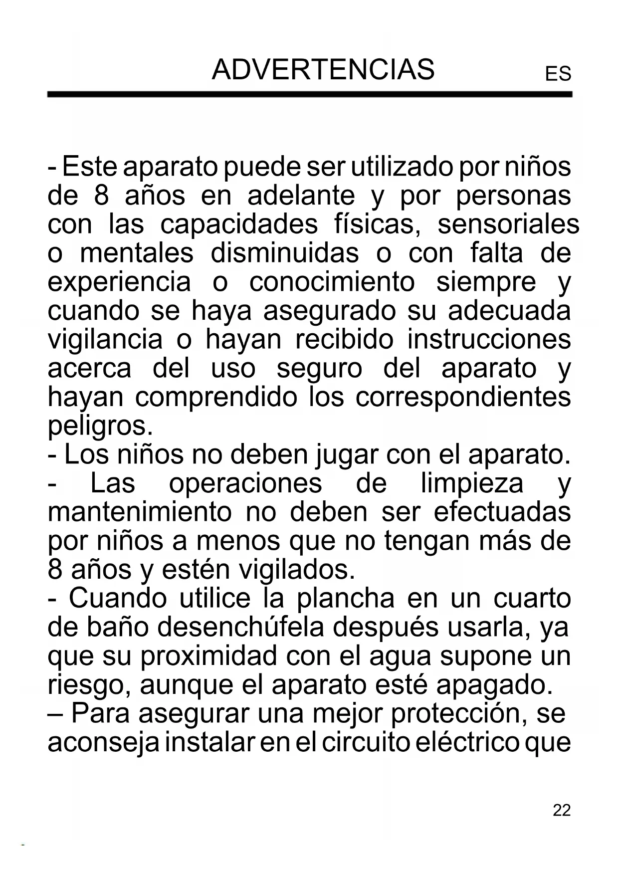 VERPACKUNG Um die Umwelt zu schonen, muss das Verpackungsmaterial ordnungsgemäß in einer getrennten Sammlung entsorgt werden. Prüfen Sie die örtlichen Vorschriften.22 - Este aparato puede ser utilizado por niños de 8 años en adelante y por personas con las capacidades físicas, sensoriales o mentales disminuidas o con falta de experiencia o conocimiento siempre y cuando se haya asegurado su adecuada vigilancia o hayan recibido instrucciones acerca del uso seguro del aparato y hayan comprendido los correspondientes peligros. - Los niños no deben jugar con el aparato. - Las operaciones de limpieza y mantenimiento no deben ser efectuadas por niños a menos que no tengan más de 8 años y estén vigilados. - Cuando utilice la plancha en un cuarto de baño desenchúfela después usarla, ya que su proximidad con el agua supone un riesgo, aunque el aparato esté apagado. – Para asegurar una mejor protección, se aconseja instalar en el circuito eléctrico que ADVERTENCIAS ES23 alimenta el cuarto de baño, un dispositifvo de corriente diferencial de functionamiento nominal que no sea superior a 30mA. Solicitar un consejo a su instalador respecto del mismo.