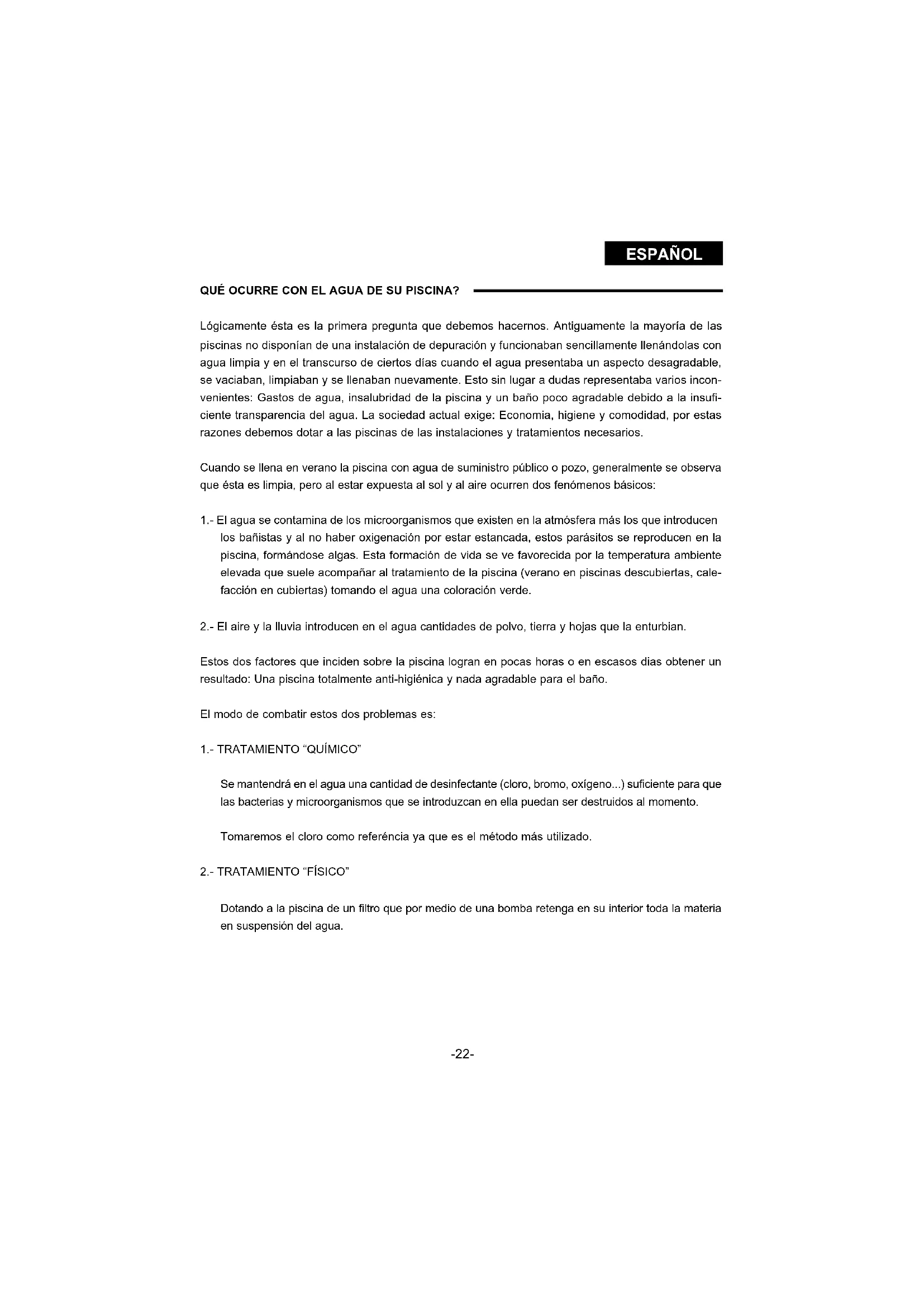 Dotando a la piscina de un filtro que por medio de una bomba retenga en su interior toda la materia en suspensión del agua. ESPAÑOL -22-EL pH El pH es el grado de acidez del agua. Los valores de pH están comprendidos entre 0 y 14, corres- pondiendo el valor 7 al grado neutro, los valores entre 0 y 7 a los grados ácidos y entre 7 y 14 a los alcalinos, si bien los valores usuales en una piscina son los comprendidos entre los valores 6, 8 y 8,4. ¿Por qué es importante el pH? “EL VALOR IDEAL DE pH EN LA PISCINA DEBE ESTAR SITUADO ENTRE 7,2 Y 7,6”. Anteriormente se indica que para la destrucción de bacterias, debemos mantener en el agua una cantidad de cloro residual suficiente para ello; pero este cloro sólo actuará eficazmente como bacteri- cida cuando el agua donde se diluye tenga un pH comprendido entre 7,2 y 7,6. Por lo indicado, es indispensable que si se tienen que destruir las bacterias se debe de mantener el pH entre los valores mencionados. Existen otros factores que obligan a mantener el pH correcto. De ser superior a 7,6, el calcio (la cal) disuelto en el agua se precipitará de forma visible, enturbiando el agua y dándole un aspecto lechoso, obstruyendo rápidamente el filtro y precipitándose en las paredes y accesorios de la piscina. Cuando el valor de pH sea inferior a 7,2 el agua será corrosiva, produciendo irritaciones en los ojos y mucosas nasales, pudiendo llegar a dañar las partes metálicas de la instalación de filtración. La calidad del agua de la piscina, depende de que se mantenga un valor pH correcto. EL CLORO Normas legales Las disposiciones sanitarias españolas vigentes determinan que el contenido de CLORO LIBRE en el agua de las piscinas debe estar comprendido entre 0,20 a 0,60 miligramos por litro. (También se dice -es lo mismo- que el contenido de CLORO LIBRE es de 0,2 a 0,6 ppm. -partes por millón-). Qué se entiende por cloro libre o residual En el agua aún después de filtrada, existen una serie de enemigos invisibles que es preciso destruir. Para esta destrucción se necesita una cantidad determinada de cloro que actuará bajo la forma de ácido hipocloroso. El que se añade por encima de esa cantidad, es decir por encima del necesario para destruir las bacterias y oxidar la materia orgánica, queda libre en el agua bajo la forma de ACIDO HIPOCLOROSO en espera de actuar contra cualquier enemigo. Este cloro que queda en el agua en espera de actuar se denomina CLORO LIBRE O RESIDUAL.