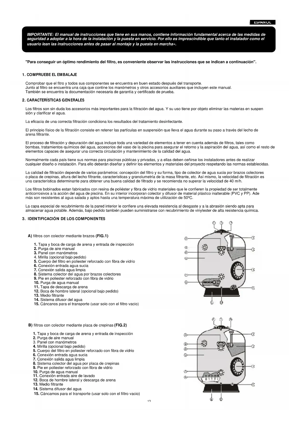 - Comprobar que todos los componentes del filtro esten en buen estado y asegurarse de que los brazos colectores o crepinas esten perfectamente sujetos ya que podrian haberse aflojado o dañado durante el transporte