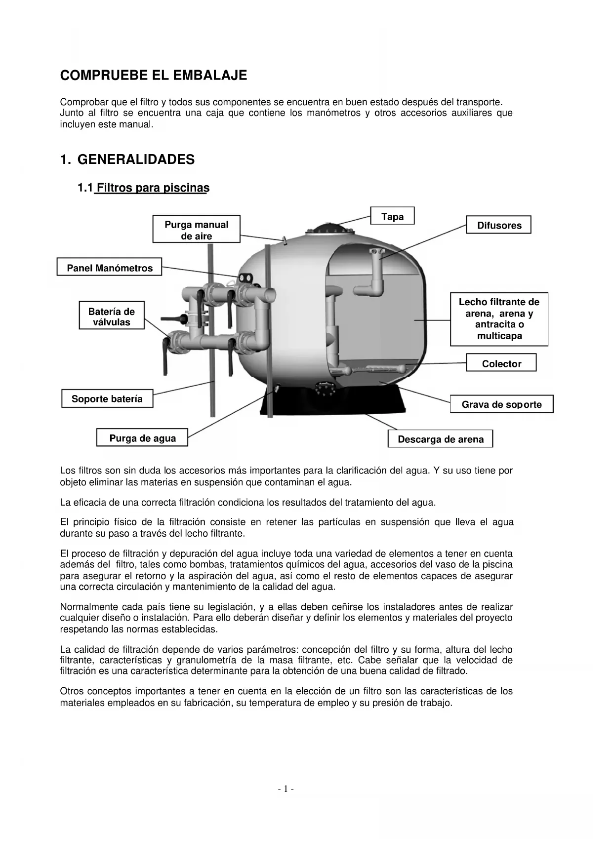 Comprobar que el filtro y todos sus componentes se encuentra en buen estado después del transporte. Junto al filtro se encuentra una caja que contiene los manómetros y otros accesorios auxiliares que incluyen este manual.