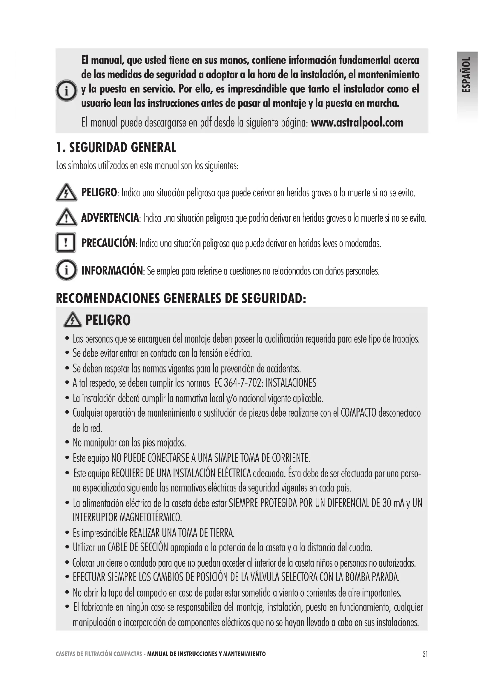 Los símbolos utilizados en este manual son los siguientes: PELIGRO: Indica una situación peligrosa que puede derivar en heridas graves o la muerte si no se evita. ADVERTENCIA: Indica una situación peligrosa que podría derivar en heridas graves o la muerte si no se evita. PRECAUCIÓN: Indica una situación peligrosa que puede derivar en heridas leves o moderadas. INFORMACIÓN: Se emplea para referirse a cuestiones no relacionadas con daños personales. El manual, que usted tiene en sus manos, contiene información fundamental acerca de las medidas de seguridad a adoptar a la hora de la instalación, el mantenimiento y la puesta en servicio. Por ello, es imprescindible que tanto el instalador como el usuario lean las instrucciones antes de pasar al montaje y la puesta en marcha. El manual puede descargarse en pdf desde la siguiente página: www.astralpool.com PELIGRO