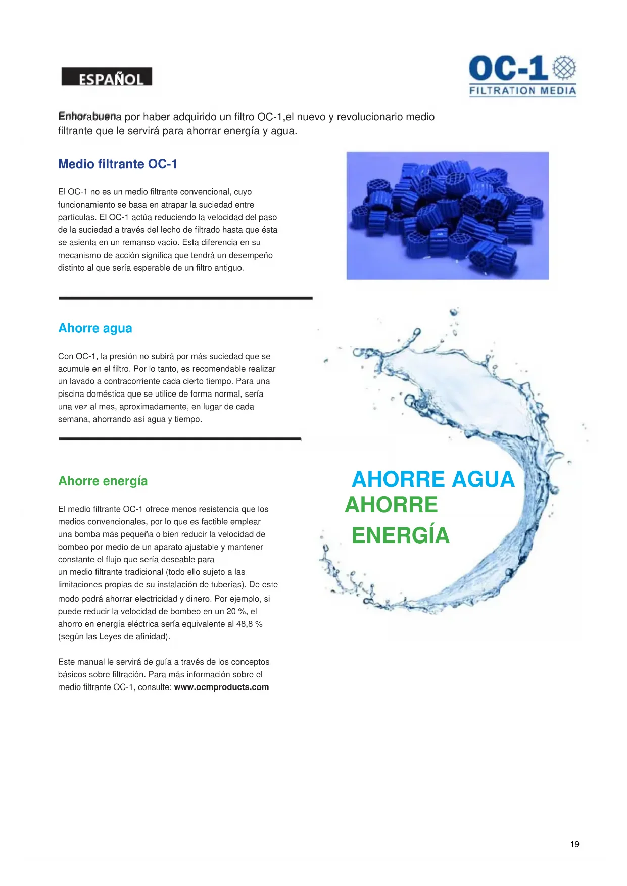 Ahorre energía El medio filtrante OC-1 ofrece menos resistencia que los medios convencionales, por lo que es factible emplear una bomba más pequeña o bien reducir la velocidad de bombeo por medio de un aparato ajustable y mantener constante el flujo que sería deseable para un medio filtrante tradicional (todo ello sujeto a las limitaciones propias de su instalación de tuberías). De este modo podrá ahorrar electricidad y dinero. Por ejemplo, si puede reducir la velocidad de bombeo en un 20 %, el ahorro en energía eléctrica sería equivalente al 48,8 % (según las Leyes de afinidad). Este manual le servirá de guía a través de los conceptos básicos sobre filtración. Para más información sobre el medio filtrante OC-1, consulte: www.ocmproducts.com AHORRE AGUA AHORRE ENERGÍA 19ESPA