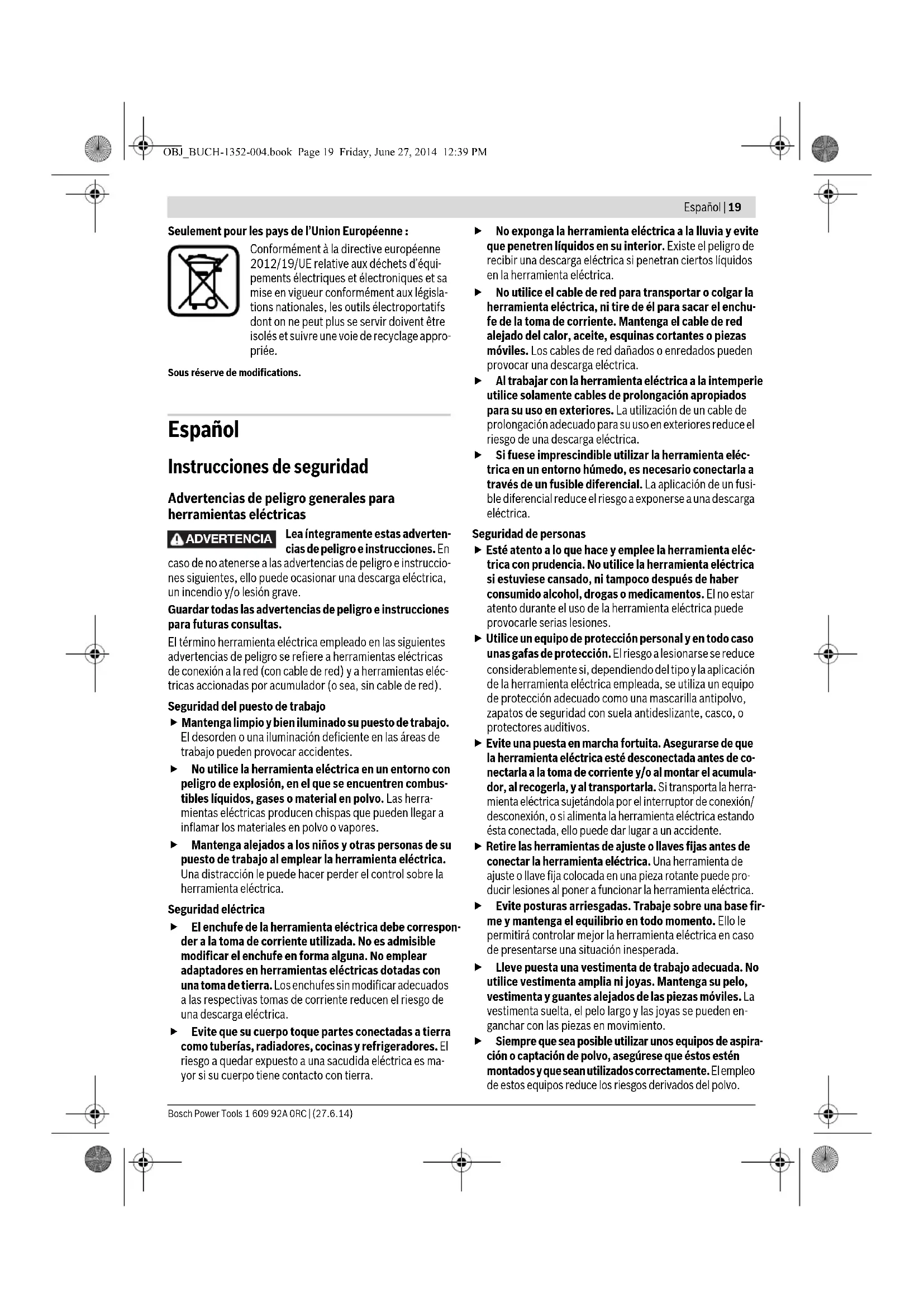 Evitez toute accumulation de poussières à l’emplacement de travail. Les poussières peuvent facilement s’enflammer. Mise en marche Mise en service Tenez compte de la tension du réseau ! La tension de la source de courant doit correspondre aux indications se trouvant sur la plaque signalétique de l’outil électro- portatif. Les outils électroportatifs marqués 230 V peuvent également fonctionner sur 220 V. Mise en Marche/Arrêt Pour mettre l’outil électroportatif en marche, appuyez sur l’interrupteur Marche/Arrêt 6 et maintenez-le appuyé. Pour arrêter l’outil électroportatif, relâchez l’interrupteur Marche/Arrêt 6. Note : Pour des raisons de sécurité, il n’est pas possible de verrouiller l’interrupteur Marche/Arrêt 6, mais celui-ci doit rester constamment appuyé pendant le travail de sciage. Afin d’économiser l’énergie, ne mettez l’outil électroportatif en marche que quand vous l’utilisez. Réglage du variateur de vitesse La pression plus ou moins importante exercée sur l’interrup- teur Marche/Arrêt 6 permet de régler en continu le nombre de courses de l’outil électroportatif en marche. Une légère pression sur l’interrupteur Marche/Arrêt 6 en- traîne un nombre de course réduit. Plus la pression sur l’inter- rupteur augmente, plus le nombre de courses est élevé. Le nombre de courses dépend du matériau à travailler et des conditions de travail et peut être déterminé par des essais pratiques. Il est recommandé de réduire la vitesse quand la lame de scie est placée au contact de la pièce à travailler ainsi que pour dé- couper des matières plastiques ou de l’aluminium. En cas de travaux assez longs avec un petit nombre de courses, l’outil électroportatif risque de chauffer fortement. Faites travailler l’outil électroportatif au nombre de courses maximal pendant une durée de 3 minutes environ afin de le laisser refroidir. Instructions d’utilisation Avant d’effectuer des travaux sur l’outil électroporta- tif, retirez la fiche de la prise de courant. Conseil Lors du sciage de matériaux de construction légers, respectez les dispositions légales ainsi que les recom- mandations du fabricant du matériau. Avant de scier dans le bois, les panneaux d’agglomérés, les matériaux de construction etc., vérifiez si ceux-ci contiennent des corps étrangers tels que clous ou vis etc., et utilisez la lame de scie appropriée. Mettez l’outil électroportatif en marche et approchez-le de la pièce à travailler. Placez la plaque de base 2 sur la surface de la pièce et sciez complètement le matériau en appliquant une pression et/ou avance régulière. Une fois l’opération de tra- vail terminée, arrêtez l’outil électroportatif. Arrêtez immédiatement l’outil électroportatif lorsque la lame de scie se coince. A l’aide d’un outil approprié, écartez légère- ment la fente de scie et retirez l’outil électroportatif. OBJ_BUCH-1352-004.book Page 17 Friday, June 27, 2014 12:39 PM18 | Français 1 609 92A 0RC | (27.6.14) Bosch Power Tools Plaque de base orientable (voir figure B) Grâce à sa mobilité, la plaque de base 2 s’adapte à la position angulaire requise de la surface en question. Coupes en plongée (voir figures C–D) Le procédé de coupes en plongée ne peut être appliqué que dans des matériaux tendres tels que le bois, les plaques de plâtre, etc. ! N’effectuez pas de coupes en plongée dans des matériaux métalliques ! Pour les coupes en plongée n’utilisez que des lames de scie courtes. Positionnez l’outil électroportatif avec le bord de la plaque de base 2 sur la pièce à travailler et mettez-le en fonctionnement. Si l’outil électroportatif dispose d’un variateur de vitesse, sé- lectionnez la vitesse maximale. Avec l’outil électroportatif exercez une pression contre la pièce à travailler et plongez lentement la lame de scie dans la pièce. Dès que la plaque de base 2 repose de toute sa surface sur la pièce à travailler, continuez à scier le long du tracé souhaité. Pour certains travaux, il est possible de monter la lame de scie 1 tournée de 180° et d’utiliser la scie sabre tournée en consé- quence. Sciage à bord franc (voir figure E) Les lames de scie bimétals souples permettent par exemple de scier au ras des murs des éléments de construction en sail- lie tels que les conduites d’eau, etc. Veillez à ce que la lame de scie soit toujours plus longue que le diamètre de la pièce à travailler. Il y a un risque de contrecoup. Placez la lame de scie directement sur le mur et pliez-la un peu pour la presser sur l’outil électroportatif en appliquant une pression latérale jusqu’à ce que la plaque de base repose sur le mur. Mettez l’outil électroportatif en marche et sciez com- plètement la pièce en appliquant une pression latérale constante. Liquides de refroidissement/lubrifiant Lors du sciage de métal, appliquez un lubrifiant ou un liquide de refroidissement le long du tracé de coupe. Entretien et Service Après-Vente Nettoyage et entretien Avant d’effectuer des travaux sur l’outil électroporta- tif, retirez la fiche de la prise de courant. Veillez à ce que l’outil électroportatif ainsi que les ouïes de ventilation soient toujours propres afin d’obtenir un travail impeccable et sûr. Nettoyez le porte-lame de préférence à l’aide de l’air compri- mé ou d’un pinceau souple. Pour ce faire, enlevez la lame de scie de l’outil électroportatif. Maintenez la fonctionnalité du porte-lame en utilisant des lubrifiants appropriés. Un fort encrassement de l’outil électroportatif risque d’entra- ver le bon fonctionnement de celui-ci. Pour cette raison, ne sciez pas les matériaux produisant beaucoup de poussières par dessous ou dans une position en hauteur. Dans le cas où un remplacement de la fiche de raccordement s’avère nécessaire, ceci ne doit être effectué que par Bosch ou une station de Servic