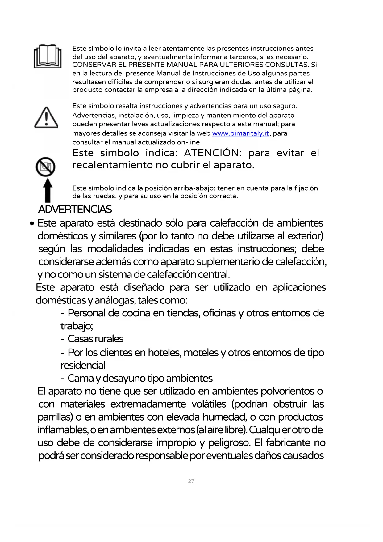 Este símbolo lo invita a leer atentamente las presentes instrucciones antes del uso del aparato, y eventualmente informar a terceros, si es necesario. CONSERVAR EL PRESENTE MANUAL PARA ULTERIORES CONSULTAS. Si en la lectura del presente Manual de Instrucciones de Uso algunas partes resultasen difíciles de comprender o si surgieran dudas, antes de utilizar el producto contactar la empresa a la dirección indicada en la última página. Este símbolo resalta instrucciones y advertencias para un uso seguro. Advertencias, instalación, uso, limpieza y mantenimiento del aparato pueden presentar leves actualizaciones respecto a este manual; para mayores detalles se aconseja visitar la web www.bimaritaly.it , para consultar el manual actualizado on-line Este símbolo indica: ATENCIÓN: para evitar el recalentamiento no cubrir el aparato. Este símbolo indica la posición arriba-abajo: tener en cuenta para la fijación de las ruedas, y para su uso en la posición correcta. ADVERTENCIAS