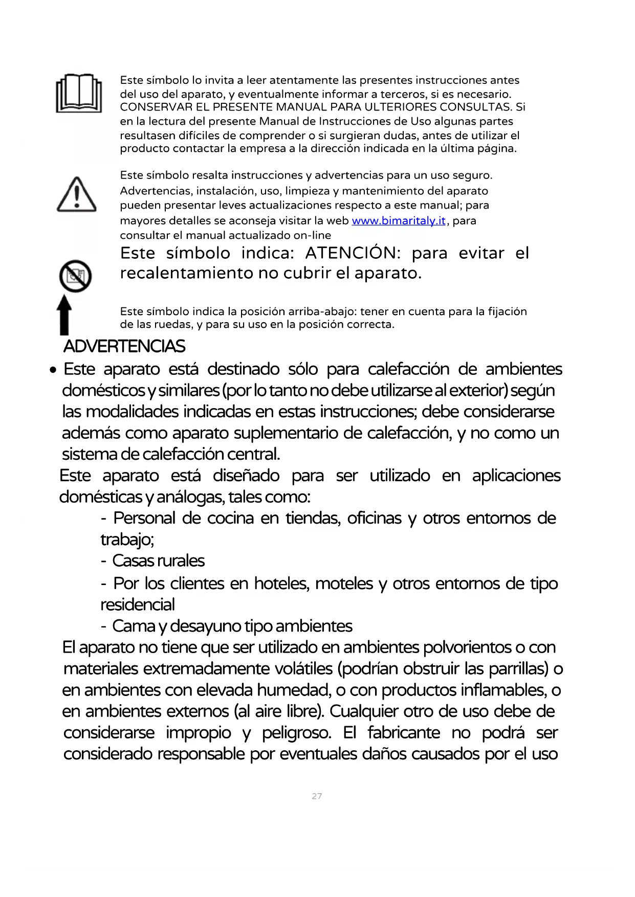 Este símbolo lo invita a leer atentamente las presentes instrucciones antes del uso del aparato, y eventualmente informar a terceros, si es necesario. CONSERVAR EL PRESENTE MANUAL PARA ULTERIORES CONSULTAS. Si en la lectura del presente Manual de Instrucciones de Uso algunas partes resultasen difíciles de comprender o si surgieran dudas, antes de utilizar el producto contactar la empresa a la dirección indicada en la última página. Este símbolo resalta instrucciones y advertencias para un uso seguro. Advertencias, instalación, uso, limpieza y mantenimiento del aparato pueden presentar leves actualizaciones respecto a este manual; para mayores detalles se aconseja visitar la web www.bimaritaly.it , para consultar el manual actualizado on-line Este símbolo indica: ATENCIÓN: para evitar el recalentamiento no cubrir el aparato. Este símbolo indica la posición arriba-abajo: tener en cuenta para la fijación de las ruedas, y para su uso en la posición correcta. ADVERTENCIAS