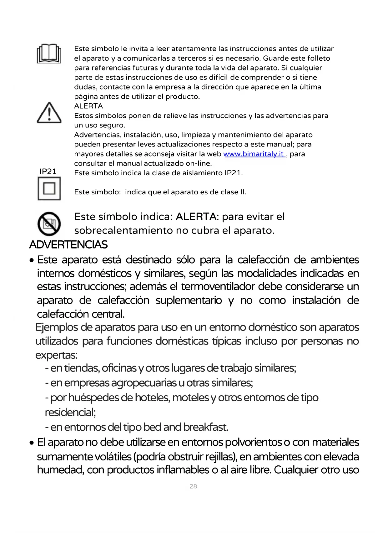 Este símbolo le invita a leer atentamente las instrucciones antes de utilizar el aparato y a comunicarlas a terceros si es necesario. Guarde este folleto para referencias futuras y durante toda la vida del aparato. Si cualquier parte de estas instrucciones de uso es difícil de comprender o si tiene dudas, contacte con la empresa a la dirección que aparece en la última página antes de utilizar el producto. ALERTA Estos símbolos ponen de relieve las instrucciones y las advertencias para un uso seguro. Advertencias, instalación, uso, limpieza y mantenimiento del aparato pueden presentar leves actualizaciones respecto a este manual; para mayores detalles se aconseja visitar la web www.bimaritaly.it , para consultar el manual actualizado on-line. Este símbolo indica la clase de aislamiento IP21. Este símbolo: indica que el aparato es de clase II. Este símbolo indica: ALERTA : para evitar el sobrecalentamiento no cubra el aparato.29 debe considerarse inadecuado y peligroso. El fabricante no podrá considerarse responsable por ninguno de los posibles daños provocados por el uso inadecuado, incorrecto o irresponsable y/o por reparaciones realizadas por personal no calificado.