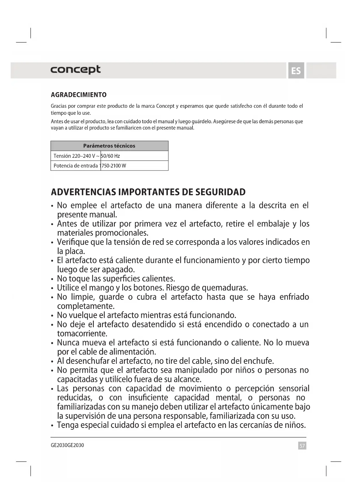 GE2030GE2030 AGRADECIMIENTO Gracias por comprar este producto de la marca Concept y esperamos que quede satisfecho con él durante todo el tiempo que lo use. Antes de usar el producto, lea con cuidado todo el manual y luego guárdelo. Asegúrese de que las demás personas que vayan a utilizar el producto se familiaricen con el presente manual. Parámetros técnicos Tensión 220–240 V ~ 50/60 Hz Potencia de entrada 1750-2100 W