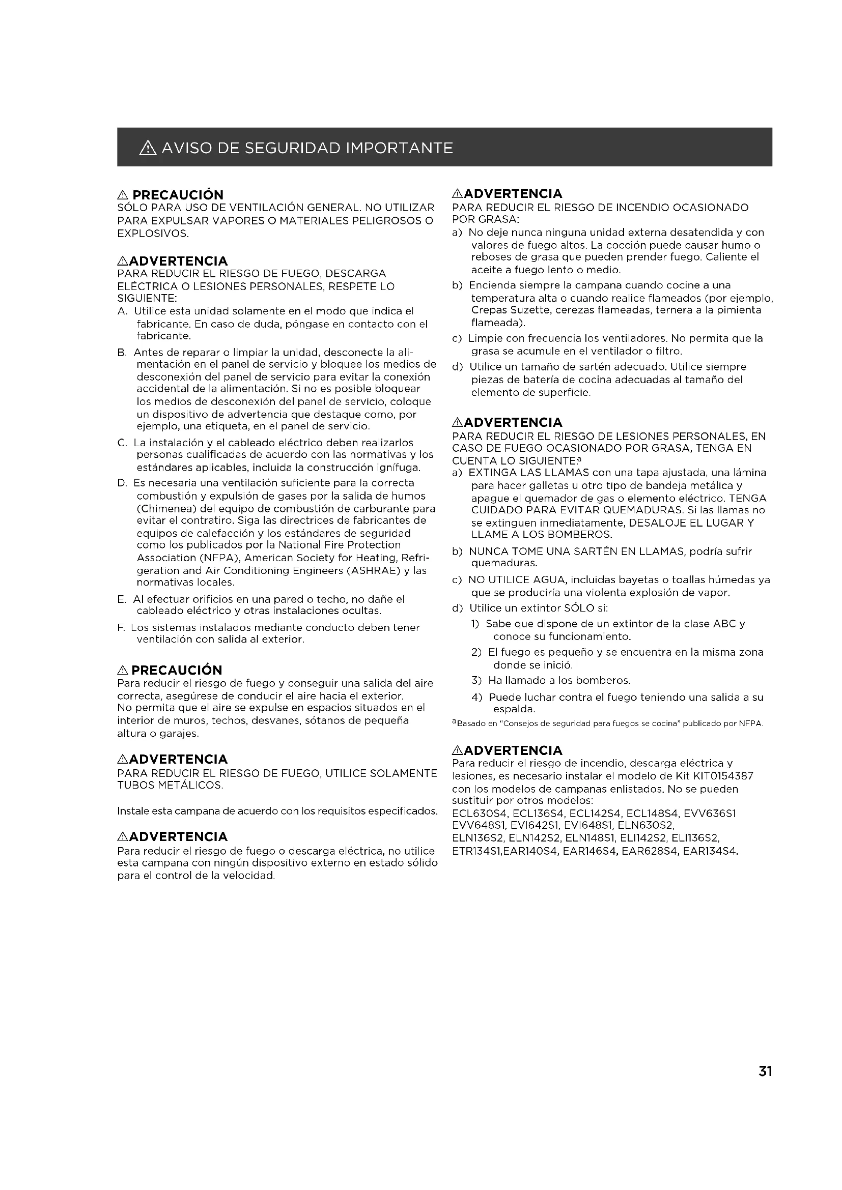 Para reducir el riesgo de incendio, descarga electrica y lesiones, es necesario instalar el Modelo de Kit KIT0154387 con los modelos de campanas enlistados. No se pueda sustituir porthersmodels: