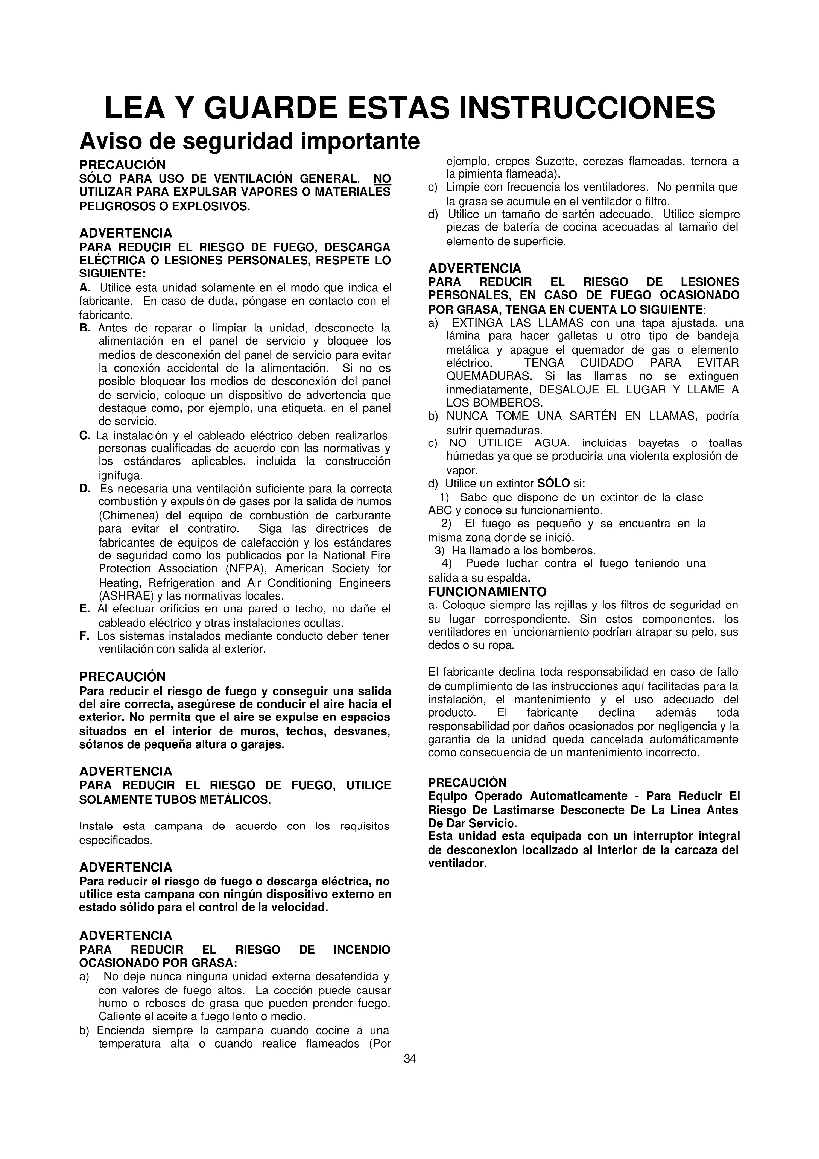 salida a su espalda. FUNCIONAMIENTO a. Coloque siempre las rejillas y los filtros de seguridad en su lugar correspondiente. Sin estos componentes, los ventiladores en funcionamiento podrían atrapar su pelo, sus dedos o su ropa. El fabricante declina toda responsabilidad en caso de fallo de cumplimiento de las instrucciones aquí facilitadas para la instalación, el mantenimiento y el uso adecuado del producto. El fabricante declina además toda responsabilidad por daños ocasionados por negligencia y la garantía de la unidad queda cancelada automáticamente como consecuencia de un mantenimiento incorrecto. PRECAUCIÓN Equipo Operado Automaticamente - Para Reducir El Riesgo De Lastimarse Desconecte De La Linea Antes De Dar Servicio. Esta unidad esta equipada con un interruptor integral de desconexion localizado al interior de la carcaza del ventilador.35 Requisitos eléctricos y de instalación Requisitos eléctricos IMPORTANTE cumpla todas las normativas y ordenanzas gubernamentales. Es responsabilidad del cliente: Ponerse en contacto con un instalador eléctrico cualificado. Asegurarse de que la instalación eléctrica es adecuada y en conformidad con National Electrical Code, ANSI/NFPA 70 (última edición*) o CSA Standards C22.1-94, Canadian Electrical Code, Parte 1 y C22.2 No.0-M91 (última edición*) y toda la normativa y las ordenanzas locales. Si la normativa lo permite y se utiliza un cable de toma a tierra independiente, se recomienda que un electricista cualificado determine si la difracción de onda de tierra es la adecuada. No ubique la toma a tierra en una tubería de gas. Si no está seguro de que la campana está correctamente conectada a tierra, consulte a un electricista cualificado. No coloque ningún fusible en el circuito neutral o con vuelta por tierra. IMPORTANTE Guarde las instrucciones de instalación para su uso por parte del inspector de electricidad. La campana debe está conectada únicamente con hilo de cobre. La campana debe estar conectada directamente al desconectador con fusible (O disyuntor) mediante canal metálico de cables eléctricos. Los tamaños de cable deben cumplir los requisitos de la National Electrical Code, ANSI/NFPA 70 (última edición*) o CSA Standards C22.1-94, Canadian Electrical Code, Parte 1 y C22.2 No.0-M91 (última edición*) y toda la normativa y las ordenanzas locales. Es preciso colocar un conector de canal de cables enumerado en U.L. o C.S.A. en cada extremo del canal de cables de fuente de alimentación (En la campana y en la caja de conexiones). Se pueden obtener copias de los estándares enumerados en: