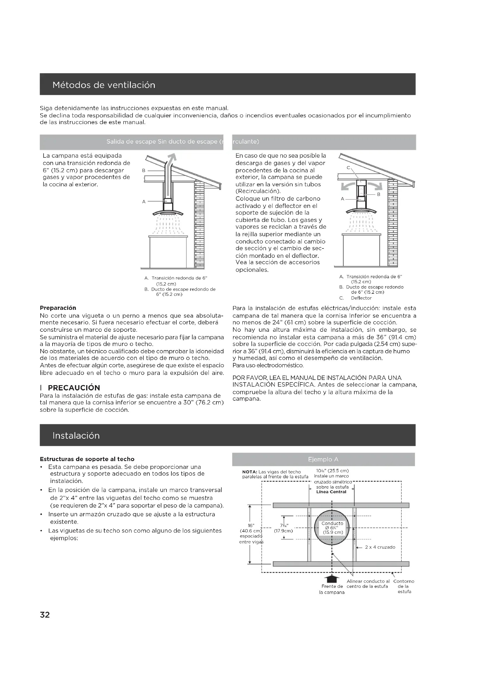 A. Transición redonda de 6” (15.2 cm)B. Ducto de escape redondo de 6” (15.2 cm)C. Deflector Preparación No corte una vigueta o un perno a menos que sea absoluta- mente necesario. Si fuera necesario efectuar el corte, deberá construirse un marco de soporte. Se suministra el material de ajuste necesario para fijar la campana a la mayoría de tipos de muro o techo. No obstante, un técnico cualificado debe comprobar la idoneidad de los materiales de acuerdo con el tipo de muro o techo. Antes de efectuar algún corte, asegúrese de que existe el espacio libre adecuado en el techo o muro para la expulsión del aire.