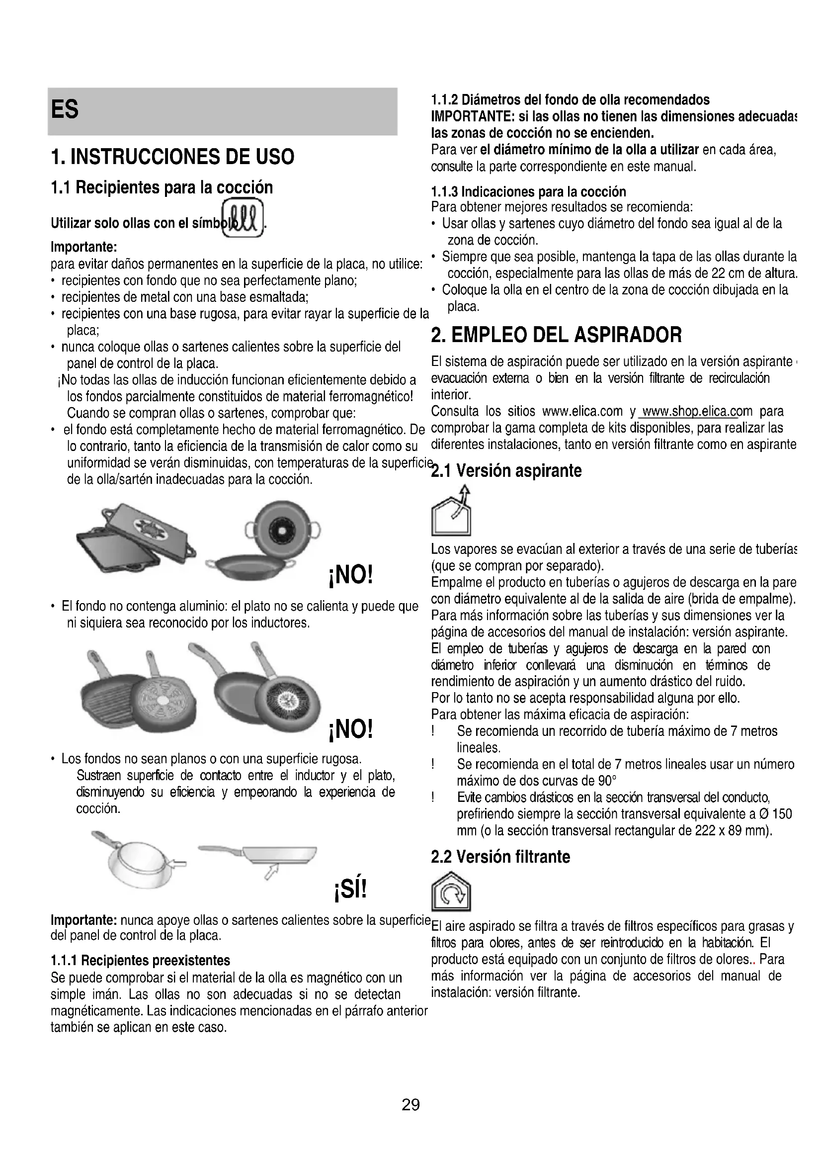 1.1.2 Díameros del fondo de olla recomendedos IMPORTANTE: si las ollas no tienen las dimensiones adecuadas, las zonas de coccción no se encienden.