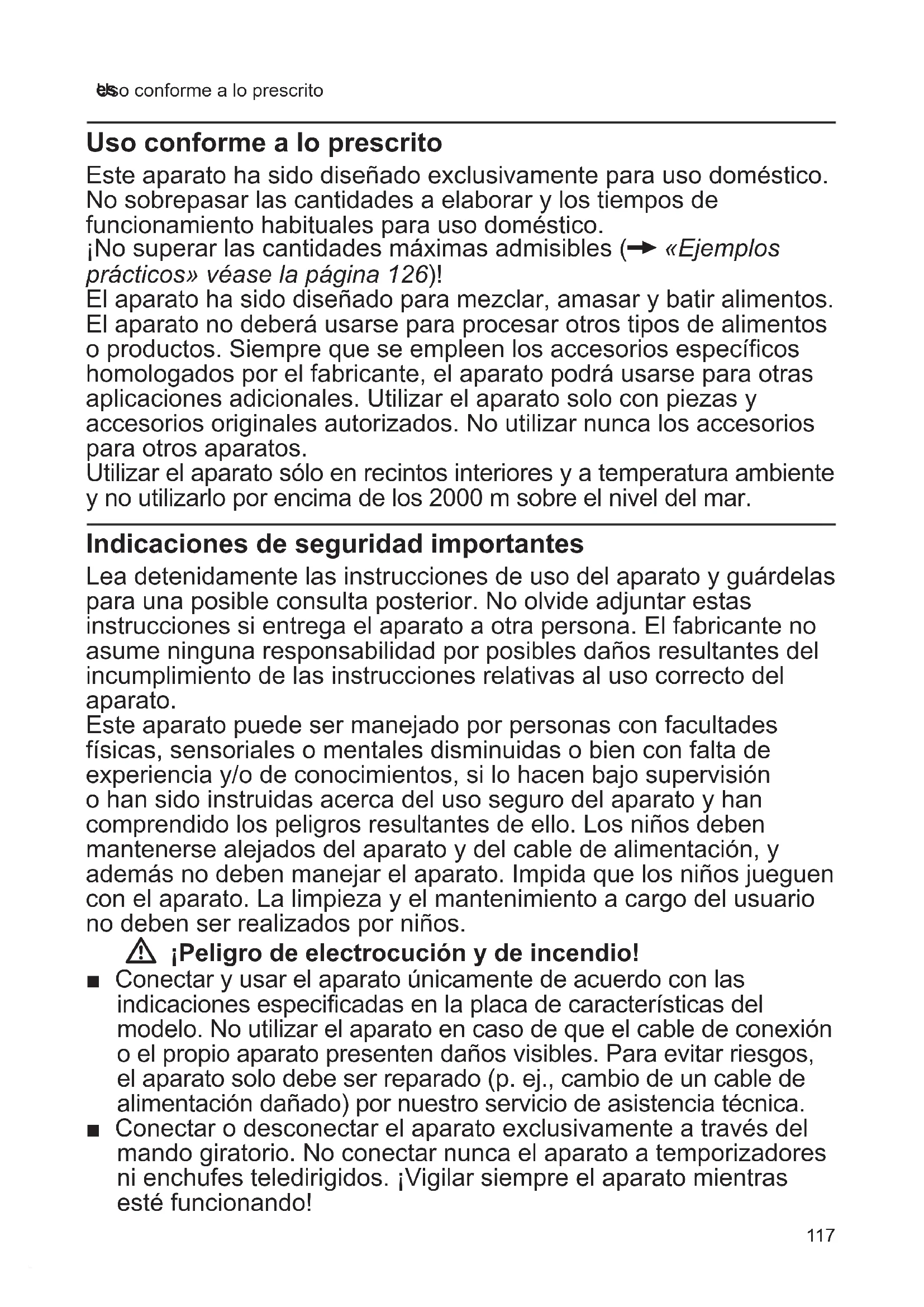 Uso conforme a lo prescrito Uso conforme a lo prescrito Este aparato ha sido diseñado exclusivamente para uso doméstico. No sobrepasar las cantidades a elaborar y los tiempos de funcionamiento habituales para uso doméstico. ¡No superar las cantidades máximas admisibles (X «Ejemplos prácticos» véase la página 126)! El aparato ha sido diseñado para mezclar, amasar y batir alimentos. El aparato no deberá usarse para procesar otros tipos de alimentos o productos. Siempre que se empleen los accesorios específicos homologados por el fabricante, el aparato podrá usarse para otras aplicaciones adicionales. Utilizar el aparato solo con piezas y accesorios originales autorizados. No utilizar nunca los accesorios para otros aparatos. Utilizar el aparato sólo en recintos interiores y a temperatura ambiente y no utilizarlo por encima de los 2000 m sobre el nivel del mar. Indicaciones de seguridad importantes Lea detenidamente las instrucciones de uso del aparato y guárdelas para una posible consulta posterior. No olvide adjuntar estas instrucciones si entrega el aparato a otra persona. El fabricante no asume ninguna responsabilidad por posibles daños resultantes del incumplimiento de las instrucciones relativas al uso correcto del aparato. Este aparato puede ser manejado por personas con facultades físicas, sensoriales o mentales disminuidas o bien con falta de experiencia y/o de conocimientos, si lo hacen bajo supervisión o han sido instruidas acerca del uso seguro del aparato y han comprendido los peligros resultantes de ello. Los niños deben mantenerse alejados del aparato y del cable de alimentación, y además no deben manejar el aparato. Impida que los niños jueguen con el aparato. La limpieza y el mantenimiento a cargo del usuario no deben ser realizados por niños. W ¡Peligro de electrocución y de incendio! ■ Conectar y usar el aparato únicamente de acuerdo con las indicaciones especificadas en la placa de características del modelo. No utilizar el aparato en caso de que el cable de conexión o el propio aparato presenten daños visibles. Para evitar riesgos, el aparato solo debe ser reparado (p. ej., cambio de un cable de alimentación dañado) por nuestro servicio de asistencia técnica. ■ Conectar o desconectar el aparato exclusivamente a través del mando giratorio. No conectar nunca el aparato a temporizadores ni enchufes teledirigidos. ¡Vigilar siempre el aparato mientras esté funcionando!118 es Indicaciones de seguridad importantes ■ No colocar el aparato sobre o cerca de superficies calientes, como p. ej. placas eléctricas. Evitar que el cable de conexión del aparato entre en contacto con piezas calientes y cantos afilados. ■ No sumergir nunca la base motriz en agua ni lavarla en el lavavajillas. ¡No utilizar limpiadoras de vapor! No usar el aparato con las manos húmedas. ■ El aparato debe desconectarse siempre de la red eléctrica después de cada uso, cuando se vaya a dejar sin vigilancia, antes del montaje, desmontaje o limpieza y en caso de avería. W ¡Peligro de lesiones! ■ Antes de cambiar accesorios o piezas adicionales que se muevan durante el funcionamiento, apagar el aparato y desconectarlo de la red eléctrica. Tras desconectar el aparato, el accionamiento del mismo continúa girando durante unos instantes. Esperar a que el accionamiento se detenga completamente. ■ No modificar la posición del brazo giratorio con el aparato en funcionamiento. ■ ¡Utilizar las herramientas solo si el recipiente está montado y tapado y las tapas de protección de los accionamientos están colocadas! ¡Al utilizar accesorios, colocar el recipiente, la tapa y las tapas protectoras de los accionamientos siguiendo las indicaciones! ■ No introducir nunca las manos en el recipiente o en la boca de llenado mientras el aparato está en funcionamiento. No introducir ningún objeto (p. ej. cuchara) en el recipiente o en la boca de llenado. Mantener las manos, el cabello, la ropa y otros utensilios alejados de las piezas giratorias. ■ No utilizar nunca herramientas y accesorios o 2 accesorios al mismo tiempo. En caso de usar los accesorios específicos, además de estas instrucciones deberán tenerse en cuenta las instrucciones de uso específicas de los accesorios. ■ ¡Usar el accesorio solo completamente armado! No armar nunca el accesorio sobre la base motriz. Utilizar el accesorio únicamente en la posición de trabajo prevista para ello. ■ No tocar ni manipular nunca con las manos las cuchillas ni los discos picadores. ¡Sujetar las cuchillas picadoras sólo por el borde! ■ No tocar ni manipular nunca las cuchillas con las manos. ■ ¡No introducir nunca las manos en la jarra batidora montada! No poner en marcha la jarra batidora sin su tapa. ■ Tenga cuidado al manipular las cuchillas afiladas, al vaciar el recipiente y durante la limpieza.119