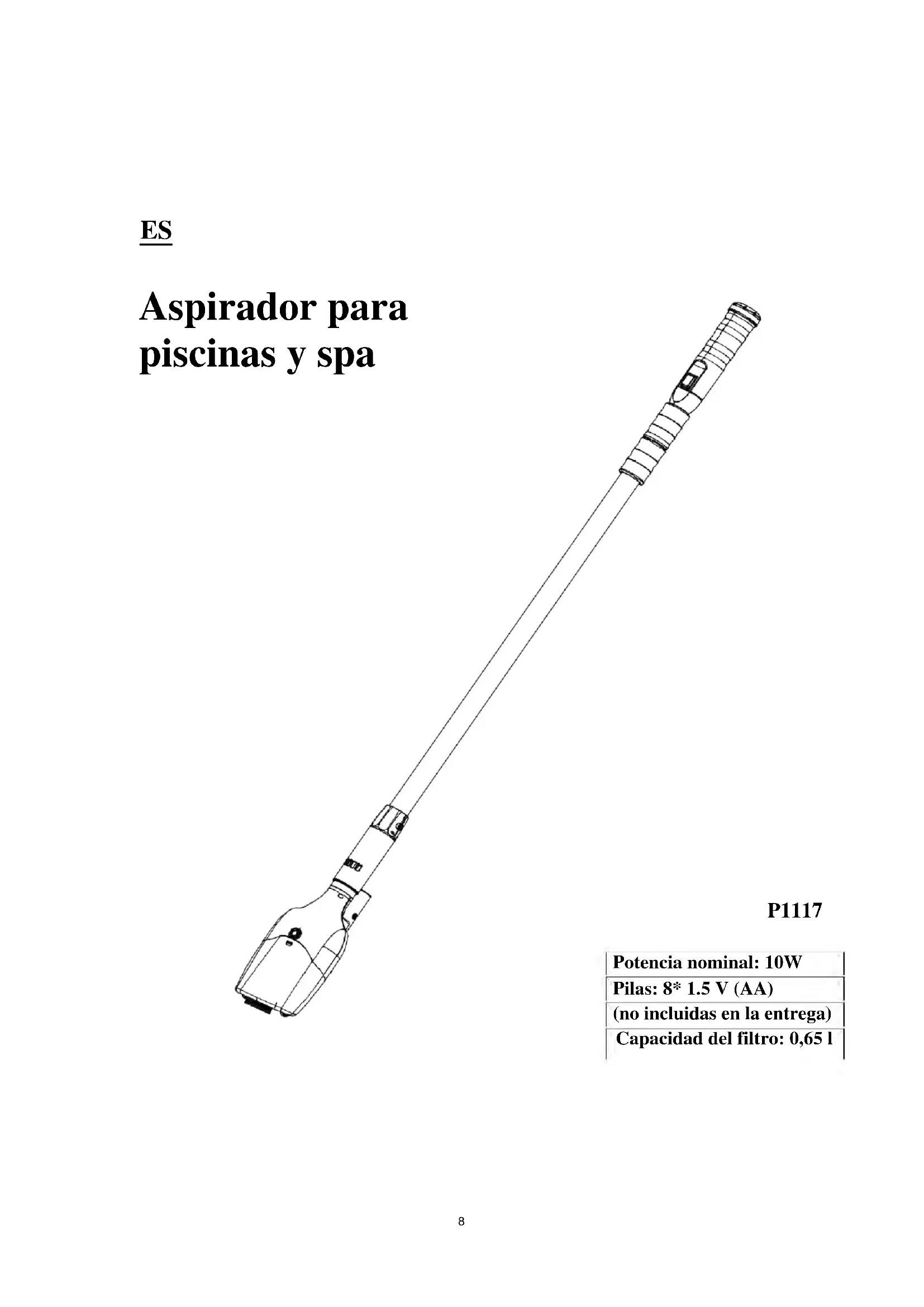 P1117 Potencia nominal: 10W Pilas: 8* 1.5 V (AA) (no incluidas en la entrega) Capacidad del filtro: 0,65 l Aspirador para piscinas y spa 8Para reducir el riesgo de incendios, descargas eléctricas, lesiones y daños en el aspirador, tenga en cuenta estas advertencias: Mantenga la tapa de las pilas del aspirador bien cerrada siempre que esté en funcionamiento, para evitar que entre el agua. Si entrase agua en la cámara, se estropearían los componentes de la unidad. Nunca deje STICK VAC en el agua si no está en funcionamiento. El aspirador está diseñado para utilizarlo EXCLUSIVAMENTE bajo el agua y debe permanecer sumergido durante su uso. No se debe poner en funcionamiento en seco, puesto que se dañaría. No utilice el aspirador para limpiar elementos distintos a piscinas, bañeras de hidromasaje o spa en superficie. El aspirador provoca succión bajo el agua, por lo que el pelo suelto, las prendas holgadas, los dedos y otras partes del cuerpo deben mantenerse apartados de las aberturas y piezas móviles. Guarde el aspirador en un lugar limpio y seco, protegido de la luz solar directa y de temperaturas extremas. Evite que el cabezal de succión atrape objetos afilados, ya que podrían dañar el filtro. No lo utilice para recoger sustancias tóxicas, inflamables o combustibles, ni lo utilice cerca de fluidos explosivos o inflamables. Lea detenidamente todas las instrucciones y directrices de seguridad que aparecen en este manual, para que su STICK VAC no deje de funcionar bien. ¡PRECAUCIÓN! 9No introduzca objetos en su interior a la fuerza. Cerciórese de que el aspirador está apagado antes de limpiar la unidad. Asegúrese de que el filtro está bien instalado antes de utilizarlo. Este aparato se puede utilizar a partir de los 12 años de edad. Las personas con discapacidad física, sensorial o psíquica o aquellas sin experiencia o conocimientos pueden emplearlo si se les supervisa y enseña a usarlo de forma segura y si comprenden los riesgos inherentes. No es un juguete infantil. Nunca utilice el aparato si ha detectado algún daño. Es preciso sustituir las piezas o los ensamblajes lo antes posible en caso de que estén dañados. Utilice exclusivamente piezas certificadas por el fabricante o el distribuidor. No utilice la limpiadora si hay personas o mascotas en el agua. Nunca intente desmontar o sustituir la hélice o el motor por su cuenta, cualquiera que sea el método. El aspirador está diseñado para utilizarlo bajo el agua. Sumérjalo mientras esté en funcionamiento para evitar que se estropee. Es apto para piscinas y spa cuya profundidad sea de 120 cm como máximo. La profundidad mínima debe ser 35 cm. La parte del mango donde está el interruptor no se debe sumergir, ya que si entra agua en él se estropea el aspirador. Cerciórese de que el filtro está bien instalado antes de utilizarlo. La temperatura del agua para utilizar el aspirador debe estar entre 4 °C (39,2 °F) y 35 °C (95 °F). 10Utilice los accesorios originales suministrados junto a este producto. No se recomienda utilizar esta limpiadora al mismo tiempo que otro aparato. Si no utiliza la parte transparente del cuerpo debe retirarla del aspirador eléctrico. No es posible que las advertencias y las precauciones recogidas aquí contemplen todas las situaciones de riesgo o de lesiones graves. Los propietarios de la piscina y del spa deben actuar con la máxima prudencia y con sensatez cuando utilicen el aspirador.