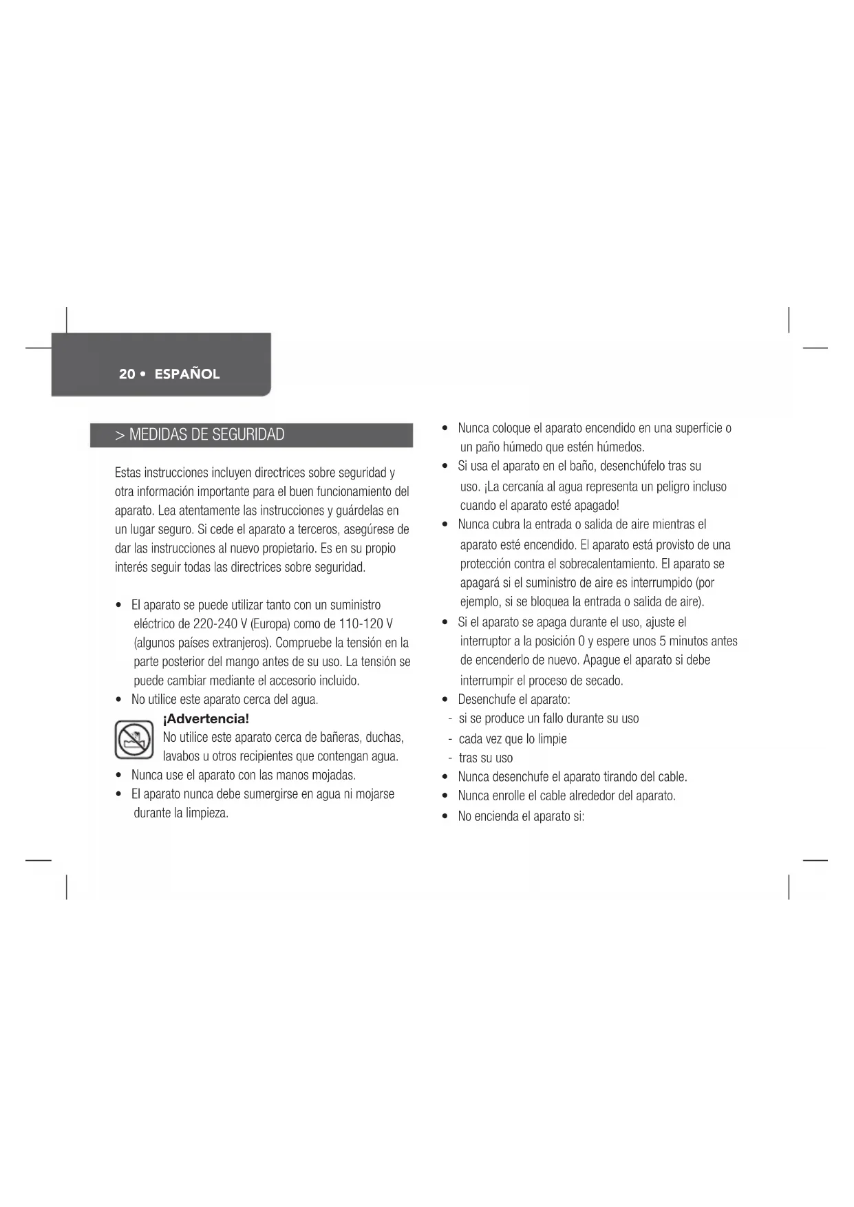 - Para evitar un mal uso involuntario, mantenga el aparato guardado en un lugar seguro. > USO Seque el cabello con una toalla tras lavarlo. Enchufe el aparato y ajuste la temperatura y flujo de aire deseados utilizando el interruptor.22 • ESPAÑOL Interruptor 0 = aparato apagado 1 = flujo de aire normal 2 = flujo de aire alto Boquilla La boquilla le permite dirigir el flujo de aire directamente hacia un área específica. Simplemente ajústela en la parte delantera del secador.