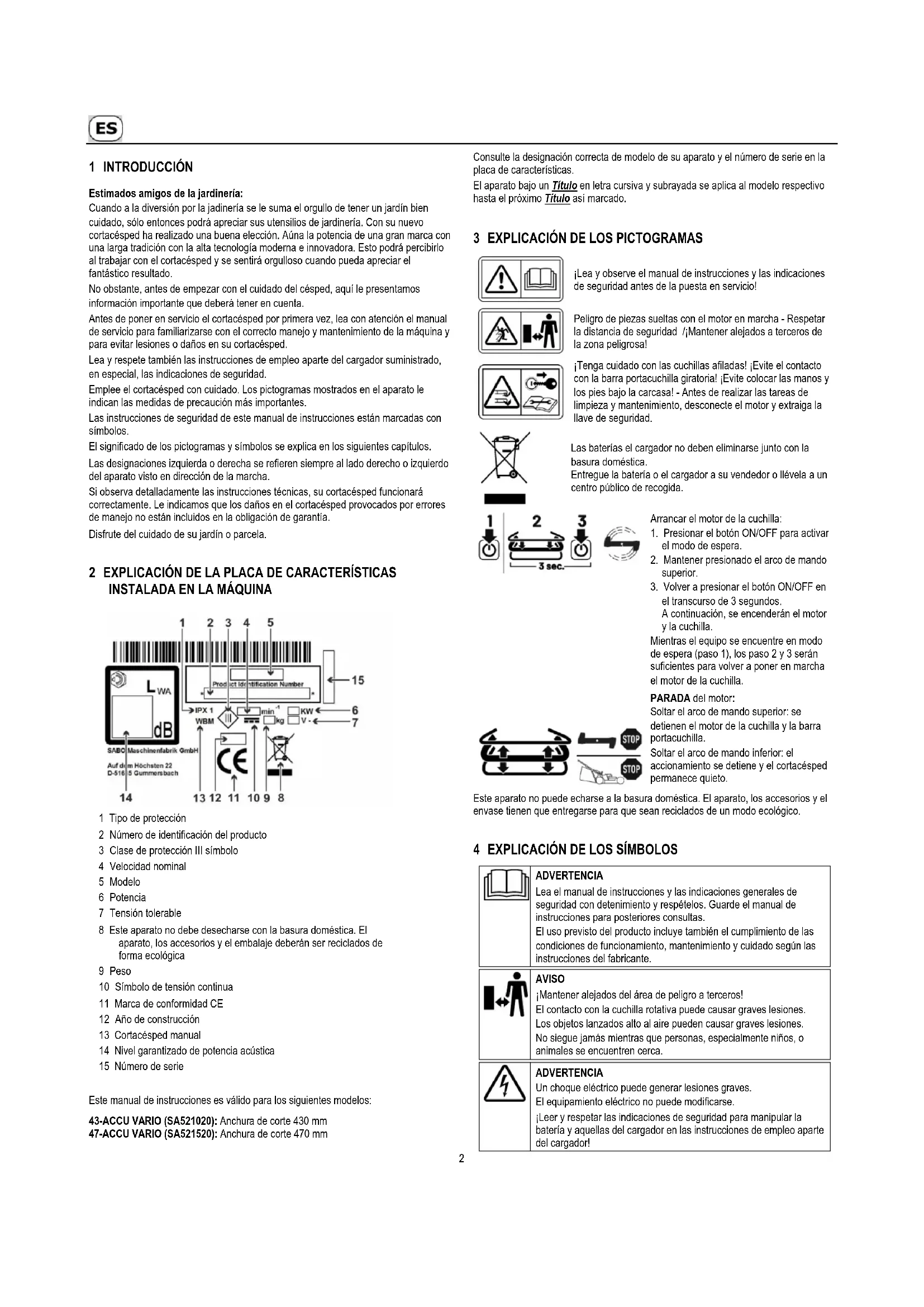 Este manual de instrucciones es válido para los siguientes modelos: 43-ACCU VARIO (SA521020): Anchura de corte 430 mm 47-ACCU VARIO (SA521520): Anchura de corte 470 mm Consulte la designación correcta de modelo de su aparato y el número de serie en la placa de características. El aparato bajo un Título en letra cursiva y subrayada se aplica al modelo respectivo hasta el próximo Título así marcado.