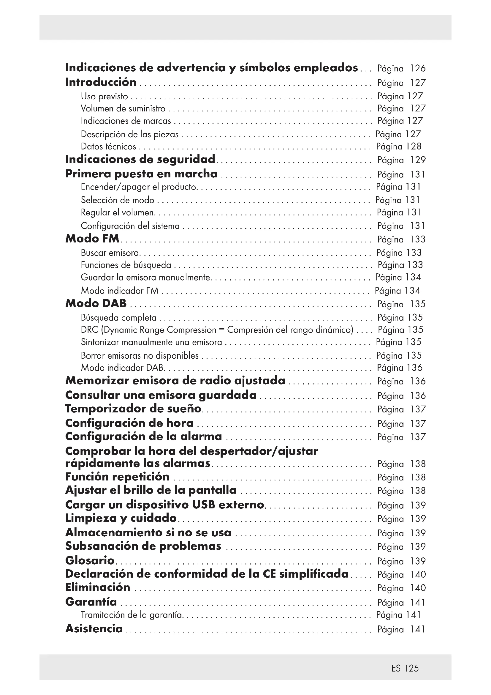 Indicaciones de advertencia y símbolos empleados ... Página 126 Introducción ................................................. Página 127 Uso previsto ................................................... Página 127 Volumen de suministro ........................................... Página 127 Indicaciones de marcas .......................................... Página 127 Descripción de las piezas ........................................ Página 127 Datos técnicos ................................................. Página 128 Indicaciones de seguridad................................. Página 129 Primera puesta en marcha ................................ Página 131 Encender/apagar el producto..................................... Página 131 Selección de modo ............................................. Página 131 Regular el volumen.............................................. Página 131 Configuración del sistema ........................................ Página 131 Modo FM..................................................... Página 133 Buscar emisora................................................. Página 133 Funciones de búsqueda .......................................... Página 133 Guardar la emisora manualmente.................................. Página 134 Modo indicador FM ............................................ Página 134 Modo DAB ................................................... Página 135 Búsqueda completa ............................................. Página 135 DRC (Dynamic Range Compression = Compresión del rango dinámico) .... Página 135 Sintonizar manualmente una emisora ............................... Página 135 Borrar emisoras no disponibles .................................... Página 135 Modo indicador DAB............................................ Página 136 Memorizar emisora de radio ajustada .................. Página 136 Consultar una emisora guardada ........................ Página 136 Temporizador de sueño.................................... Página 137 Configuración de hora ..................................... Página 137 Configuración de la alarma ............................... Página 137 Comprobar la hora del despertador/ajustar rápidamente las alarmas.................................. Página 138 Función repetición .......................................... Página 138 Ajustar el brillo de la pantalla ............................ Página 138 Cargar un dispositivo USB externo....................... Página 139 Limpieza y cuidado......................................... Página 139 Almacenamiento si no se usa ............................. Página 139 Subsanación de problemas ............................... Página 139 Glosario...................................................... Página 139 Declaración de conformidad de la CE simplificada..... Página 140 Eliminación .................................................. Página 140 Garantía ..................................................... Página 141 Tramitación de la garantía........................................ Página 141 Asistencia .................................................... Página 141126