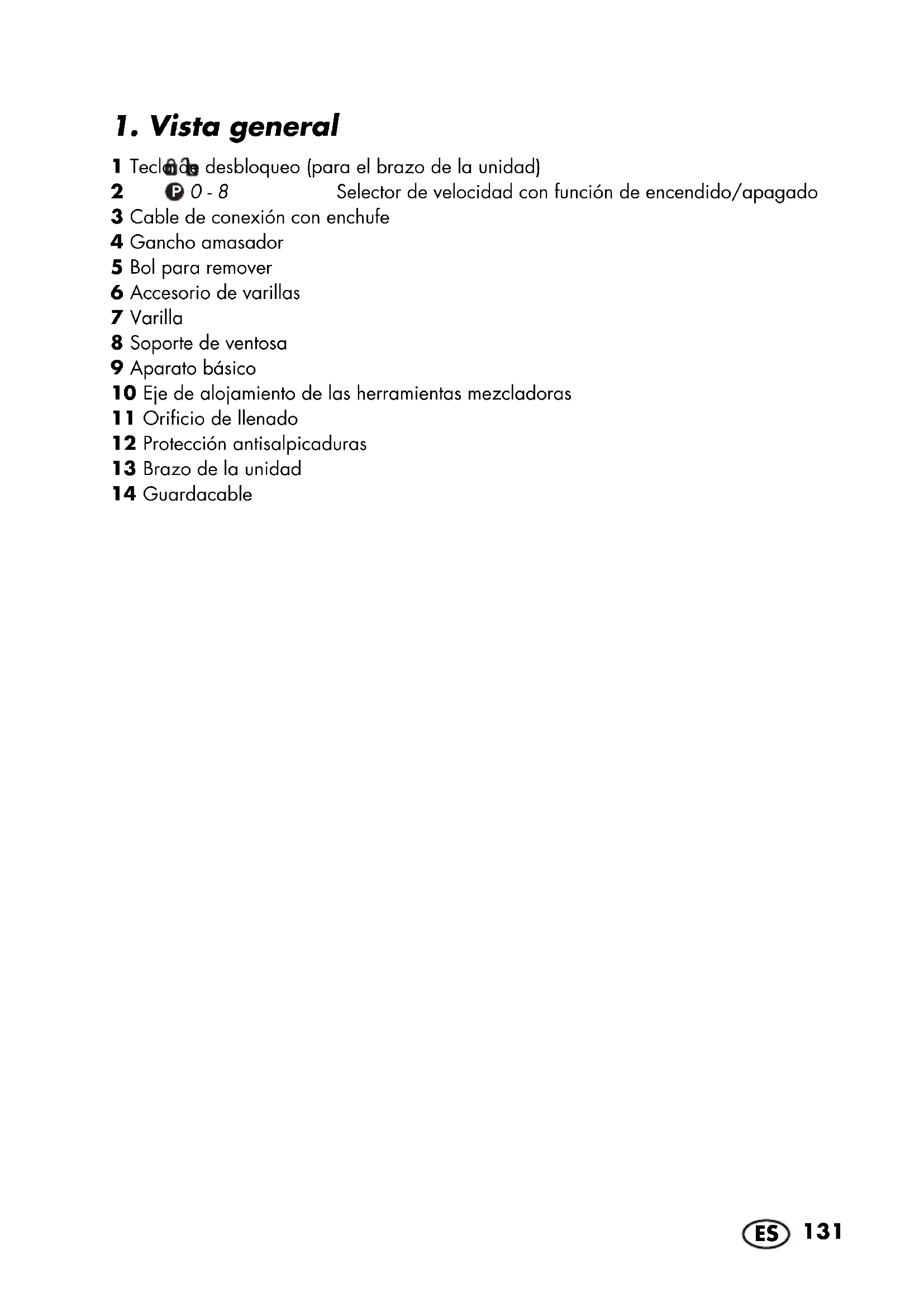 1 Tecla de desbloqueo (para el brazo de la unidad) 2 0 - 8 Selector de velocidad con función de encendido/apagado 3 Cable de conexión con enchufe 4 Gancho amasador 5 Bol para remover 6 Accesorio de varillas 7 Varilla 8 Soporte de ventosa 9 Aparato básico 10 Eje de alojamiento de las herramientas mezcladoras 11 Orificio de llenado 12 Protección antisalpicaduras 13 Brazo de la unidad 14 Guardacable
