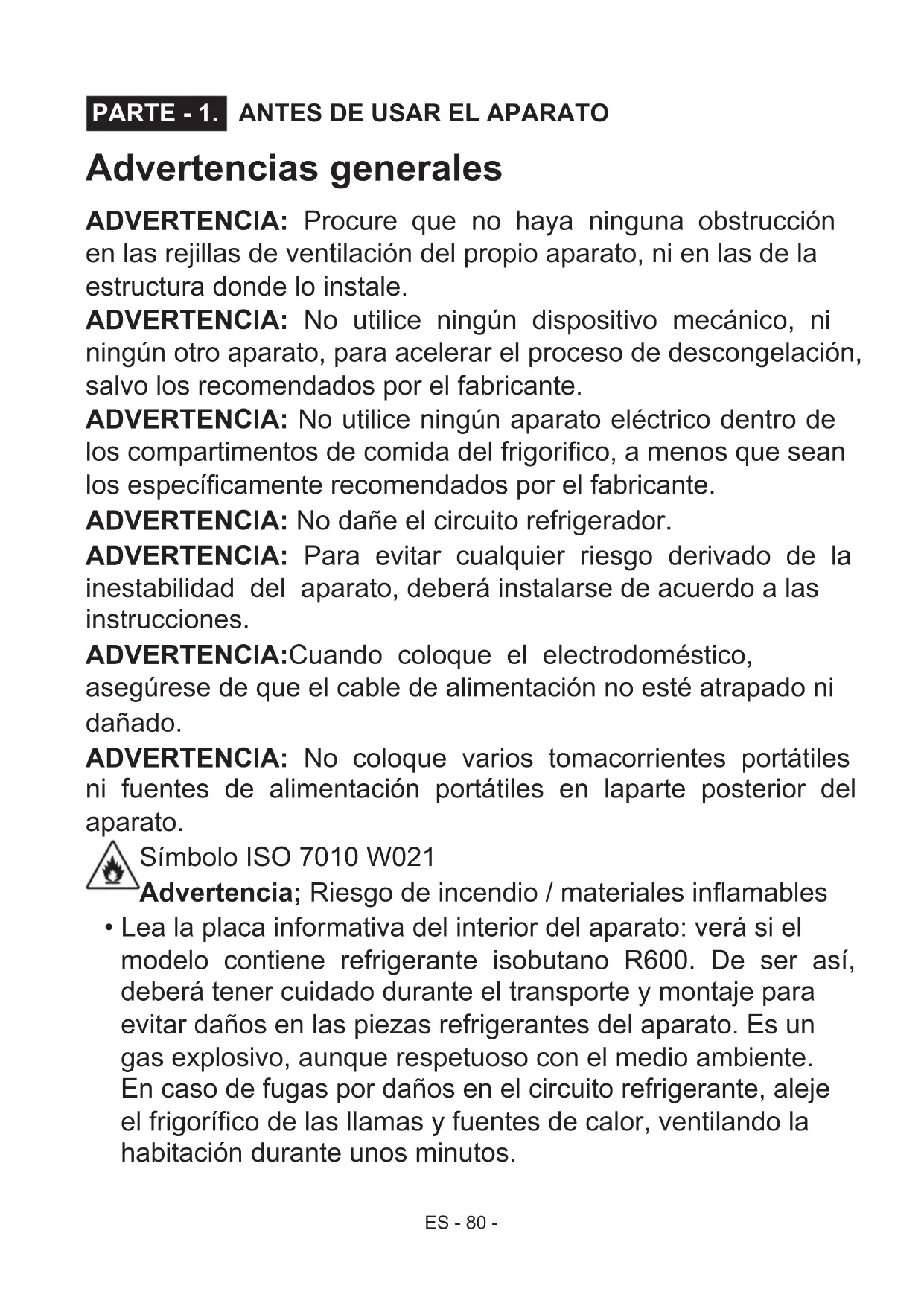Consejos Para Ahorrar Energía .................................................................97 LOS COMPONENTES DEL APARATO Y COMPARTIMENTOS ............ 98ES - 80 - Advertencias generales ADVERTENCIA: Procure que no haya ninguna obstrucción en las rejillas de ventilación del propio aparato, ni en las de la estructura donde lo instale. ADVERTENCIA: No utilice ningún dispositivo mecánico, ni ningún otro aparato, para acelerar el proceso de descongelación, salvo los recomendados por el fabricante. ADVERTENCIA: No utilice ningún aparato eléctrico dentro de los compartimentos de comida del frigorico, a menos que sean los especícamente recomendados por el fabricante. ADVERTENCIA: No dañe el circuito refrigerador. ADVERTENCIA: Para evitar cualquier riesgo derivado de la inestabilidad del aparato, deberá instalarse de acuerdo a las instrucciones. ADVERTENCIA:Cuando coloque el electrodoméstico, asegúrese de que el cable de alimentación no esté atrapado ni dañado. ADVERTENCIA: No coloque varios tomacorrientes portátiles ni fuentes de alimentación portátiles en laparte posterior del aparato. Símbolo ISO 7010 W021 Advertencia; Riesgo de incendio / materiales inamables