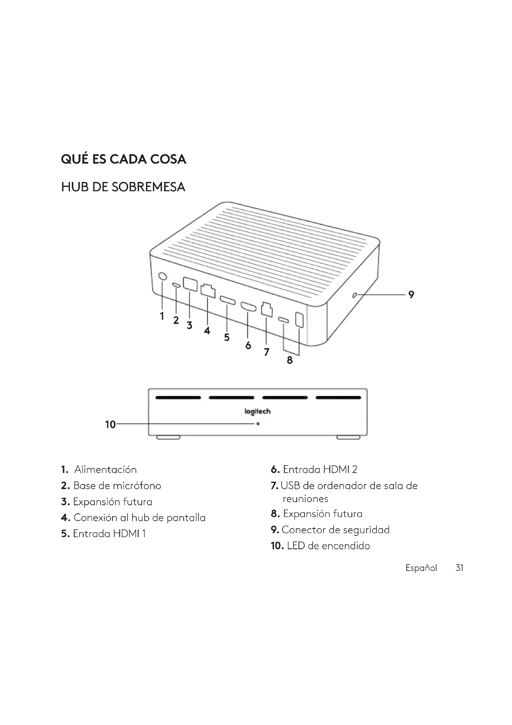 SETTINGS Use este programa para controlar desde el ordenador las funciones de panorámica, inclinación, zoom y enfoque, y la calidad de imagen (por ejemplo, el brillo y el contraste). El software se puede descargar desde www.logitech.com/support/Rally.Español 37 OPTIMIZAR RALLY Hay varios accesorios opcionales que facilitan la instalación y permiten el uso de RALLY PLUS en salas más grandes: