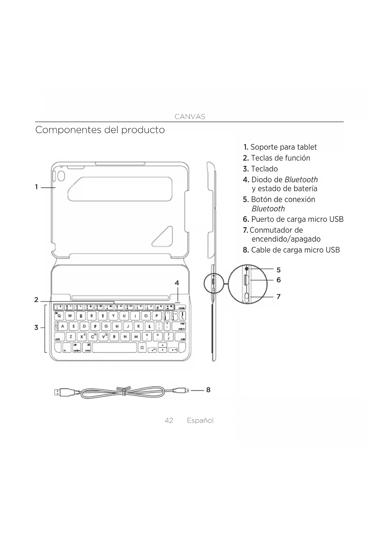 47 Español Diodos de estado El diodo de estado de la funda con teclado proporciona información sobre la carga delabatería del teclado y la conexión Bluetooth: Diodo Descripción Verde La batería tiene una carga adecuada. Rojo La carga de la batería es baja (menos del 10%). Cargue la batería. Destellos azules Rápidos: El teclado está en modo de detección, listo para emparejar. Lentos: El teclado está intentando reconectarse al iPad. Azul permanente El emparejamiento o la reconexión Bluetooth se ha realizado correctamente.CANVAS 48 Español Teclas de función Fn + 1 = Bloquear pantalla Bloquea o desbloquea la pantalla deliPad mini Fn + 2 = Siri Usa tu voz para enviar mensajes, realizar llamadas, programar reuniones, etc. Fn + 3 = Buscar Inicia la función de búsqueda deliPadmini Fn + 4 = Cambiar idioma Cambia el idioma del teclado Fn + 5 = Teclado virtual Muestra/oculta el teclado virtual Fn + 6 = Captura de pantalla Fn + 7 = Pista anterior Fn + 8 = Reproducir/Pausa Fn + 9 = Pista siguiente Fn + 0 = Silenciar Fn + menos = Bajar volumen Fn + más = Subir volumen Inicio = Pantalla de inicio deliPadmini Muestra la pantalla de inicio deliPadmini Fn + X = Cortar Fn + C = Copiar Fn + V = Pegar Fn + Flecha izquierda = Seleccionarizquierda Selecciona texto a la izquierda, palabra por palabra Fn + Flecha derecha = Seleccionarderecha Selecciona texto a la derecha, palabrapor palabra Fn + Barra espaciadora = Cambiaraplicaciones Nota: Para seleccionar una tecla de función, mantén pulsada la tecla Fn y pulsa la tecla indicada arriba.CANVAS 49 Español Carga de la batería del teclado Si la luz del diodo de estado de la batería es roja, es preciso cargar la batería de lafunda con teclado.