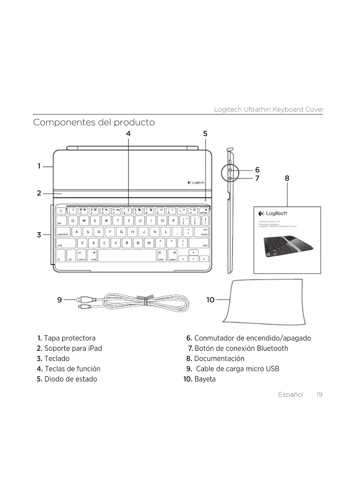- Piezas de repuesto (cuando estén disponibles) Ve a www.logitech.com/support/ ultrathinkeyboardcoverLogitech Ultrathin Keyboard Cover Español 23 Utilización del producto Características del producto
