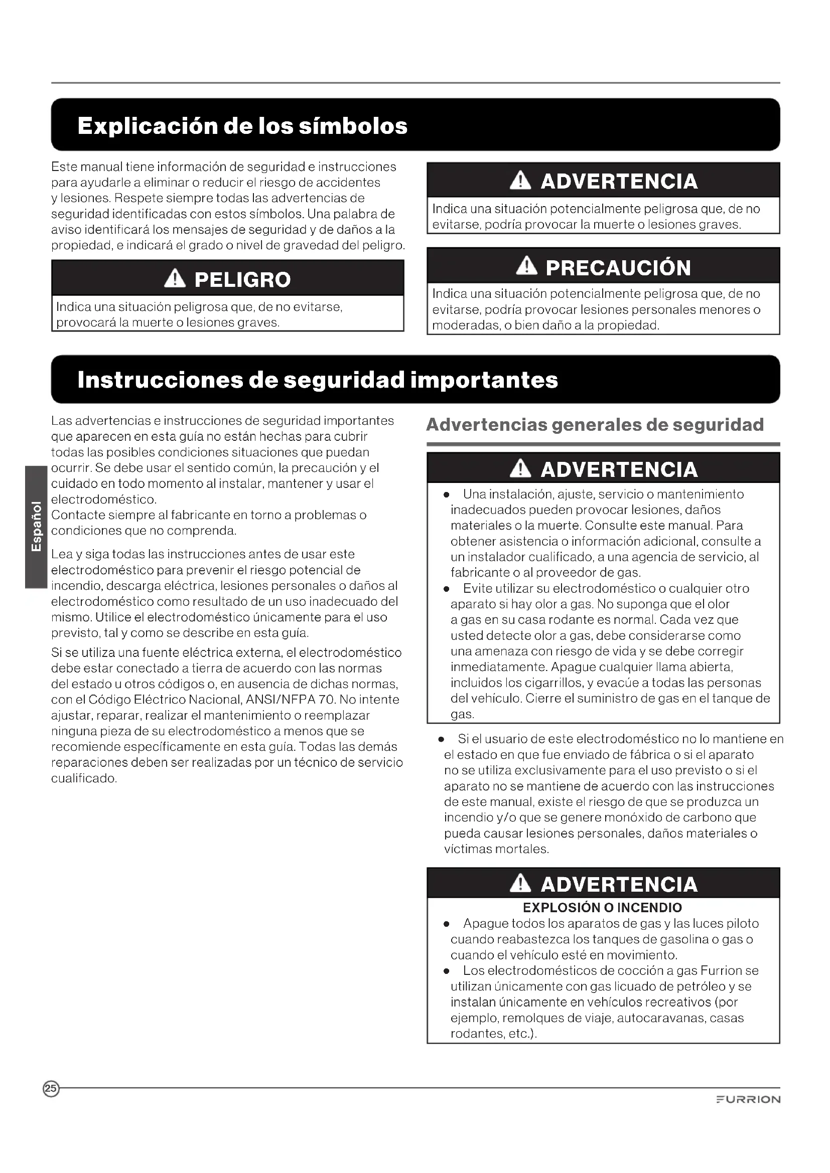 (76mm) 3⅛” (79mm) 4⁄” (116mm) 23¼” (591mm) Caractéristiques techniques BTU/HR Au niveau central min. 2000BTU/h., max. 7500BTU/h. Gauche et droit min. 1800BTU/h., max. 7500BTU/h. Carburant / Électricité Propane (GPL) Pression d’entrée min. 10poWC, max. 13,8poWC Entrée d'alimentation Pile 1,5VAA Cet appareil est conforme aux directives suivantes: ANSI Z21.57a-(2012) Rec/CAN1-1.16-M79 (R2011)23 Español Gracias por comprar este producto de Furrion®. Antes de usar su nuevo electrodoméstico, lea atentamente estas instrucciones. Este manual de instrucciones contiene información relativa al uso seguro, a la instalación y al mantenimiento del electrodoméstico. Guarde este manual de instrucciones en un lugar seguro para usarlo como referencia a futuro. Esto garantizará un uso seguro y reducirá el riesgo de lesiones. Asegúrese de entregar este manual a los nuevos propietarios del electrodoméstico. El fabricante no acepta responsabilidad por daños provocados por no seguir estas instrucciones. ADVERTENCIA: Si no se sigue exactamente la información de este manual, puede producirse un incendio o una explosión que provoque daños materiales, lesiones personales o la muerte.