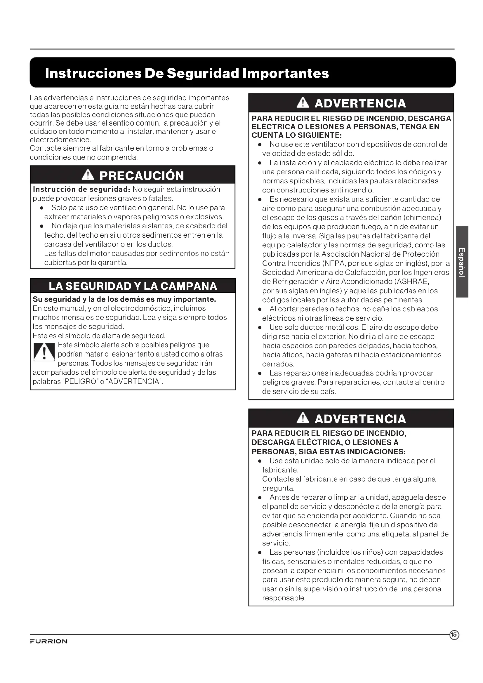 Gracias por adquirir la campana horizontal de 12 V para vehículos recreaciones de Furrion. Antes de operar su nuevo dispositivo, lea estas instrucciones cuidadosamente. Este manual de instructuciones contiene informacion para el uso, la instalacion y el mantenimiento seguros del dispositivo.