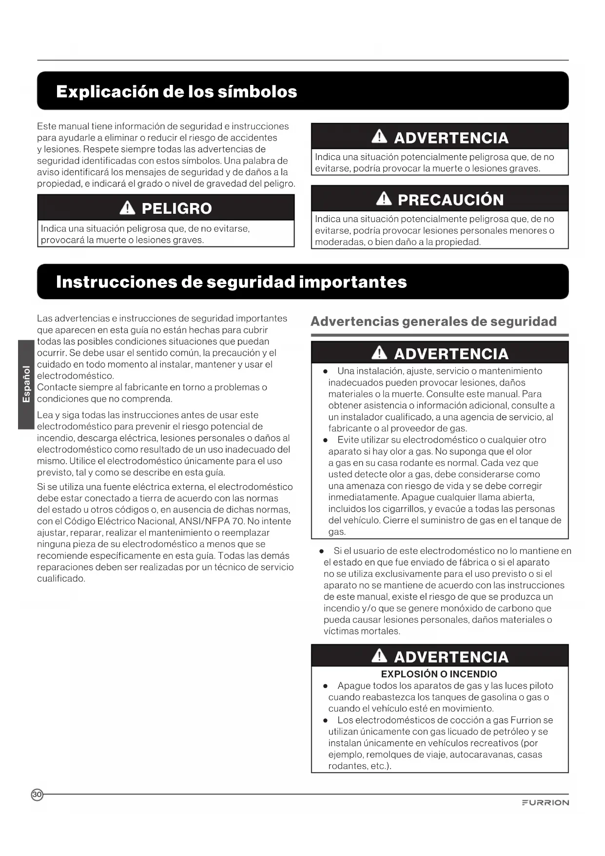 ● Apague todos los aparatos de gas y las luces piloto cuando reabastezca los tanques de gasolina o gas o cuando el vehículo esté en movimiento. ● Los electrodomésticos de cocción a gas Furrion se utilizan únicamente con gas licuado de petróleo y se instalan únicamente en vehículos recreativos (por ejemplo, remolques de viaje, autocaravanas, casas rodantes, etc.).31 Español ADVERTENCIA INTOXICACIÓN POR MONÓXIDO DE CARBONO ● NO utilice la cocina o el anafe para calentar o calefaccionar el vehículo. Podría sufrir quemaduras o lesiones, provocar un incendio o agotar el oxígeno en el vehículo. ● Se debe tener una ventana o una salida de aire ligeramente abiertas mientras se use cualquier aparato de cocción. Las llamas de gas consumen oxígeno, el cual debe ser reemplazado para asegurar una combustión adecuada. ● NO almacene ni utilice gasolina u otros vapores y líquidos inflamables cerca de este o cualquier otro electrodoméstico. ● NO utilice el electrodoméstico si está dañado o no funciona correctamente. ● Nunca intente reparar el electrodoméstico usted mismo. Cualquier reparación o instalación de este electrodoméstico debe ser realizada por un instalador cualificado, una agencia de servicio o el proveedor de gas y conforme a las instrucciones de este manual. La reparación o mantenimiento del electrodoméstico por parte de una persona o agencia de servicio no autorizada podría provocar una falla en la integridad del electrodoméstico y podría ocasionar daños materiales, lesiones graves o víctimas mortales. ● Solicite a su distribuidor que le muestre dónde se encuentra la válvula principal de cierre de gas y cómo cerrarla en caso de emergencia. ● Utilice el electrodoméstico únicamente para el uso previsto. ● Se debe enseñar a los niños que el electrodoméstico no es un juguete. No se les debe permitir jugar con los controles ni con ninguna otra parte del electrodoméstico. No permita que nadie se pare o se siente encima del electrodoméstico. Esto no sólo puede dañar el electrodoméstico, sino que también puede ocasionar lesiones personales. ● No guarde objetos de interés para los niños en armarios que estén encima o cerca del electrodoméstico. Si los niños se suben al electrodoméstico para alcanzar objetos pueden sufrir lesiones graves. ● Todas las perillas de control deben estar apagadas cuando no estén en uso. Puede haber peligro de incendio y/o sufrir quemaduras si se deja encendido accidentalmente un quemador. ● Si algún quemador se apaga (después de haberlo encendido o debido al viento), cierre todas las perillas de los quemadores y espere cinco (5) minutos antes de intentar encenderlo de nuevo. ● NO guarde materiales inflamables sobre, dentro o cerca del electrodoméstico. Cualquier vapor o gas puede crear una explosión y/o peligro de incendio. ● No use ropa holgada o de manga larga mientras utilice el electrodoméstico. Si entran en contacto con la llama abierta del quemador, podrían encenderse y causar quemaduras graves. ● Utilice únicamente paños o guantes de cocina secos para quitar los utensilios calientes. El uso de paños o guantes de cocina húmedos en superficies calientes puede provocar quemaduras en las manos. No utilice una toalla o un paño voluminoso como guante de cocina. El paño podría entrar en contacto con la llama abierta y prenderse fuego. ● Nunca caliente un recipiente sin abrir. La acumulación de presión dentro del recipiente puede hacer que explote. ● No utilice agua para apagar incendios provocados por grasa o aceite. Nunca recoja un recipiente de cocción en llamas. Ahogue el fuego de un recipiente de cocción en llamas con una tapa u otro recipiente plano. La grasa en llamas fuera del recipiente de cocción se puede extinguir con bicarbonato de sodio o con un extintor de polvo químico seco multipropósito. ● Este electrodoméstico est diseñdo pr ser instldo en un estructur de rmrio únicmente y no est diseñdo pr ser instldo l estructur del edificio. Seguridad del anafe ● No coloque las ollas sobre la superficie del vidrio. Levante la tapa hasta la posición completamente abierta antes de encender los quemadores. Deje enfriar el anafe antes de cerrar la tapa de vidrio. ● Si el anafe está cerca de una ventana, se deben tomar las precauciones adecuadas para evitar que el viento mueva las cortinas sobre los quemadores lo cual genera un riesgo de incendio. ● Mantenga limpia el área alrededor del anafe y retire cualquier material combustible, gasolina u otros vapores y líquidos inflamables. Si no lo hace, puede provocar una explosión y/o un incendio. ● No deje a los niños solos o sin supervisión en el área donde se esté usando el anafe. Los quemadores superiores, las rejillas de los quemadores y otras áreas cercanas a los quemadores se calientan lo suficiente como para provocar quemaduras graves. ● No use ropa holgada o de manga larga mientras utilice el electrodoméstico. Si entran en contacto con la llama abierta del quemador, podrían encenderse y causar quemaduras graves. ● Utilice únicamente paños o guantes de cocina secos para quitar los utensilios calientes. El uso de paños o guantes de cocina húmedos en superficies calientes puede provocar quemaduras en las manos. No utilice una toalla o un paño voluminoso como guante de cocina. El paño podría entrar en contacto con la llama abierta y prenderse fuego. ● Nunca caliente un recipiente sin abrir. La acumulación de presión dentro del recipiente puede hacer que explote. ● Mantenga limpio el electrodoméstico. La acumulación de grasa y alimentos derramados o vertidos puede generar un riesgo de incendio. ● Gire las asas de las ollas hacia adentro o hacia atrás del anafe y fuera del alcance de las personas que pasen por delante del anafe y/o fuera del alcance de los niños. No gire las manijas hacia donde están sobre los quemadores. ● No utilice agua para apagar incendios provoca