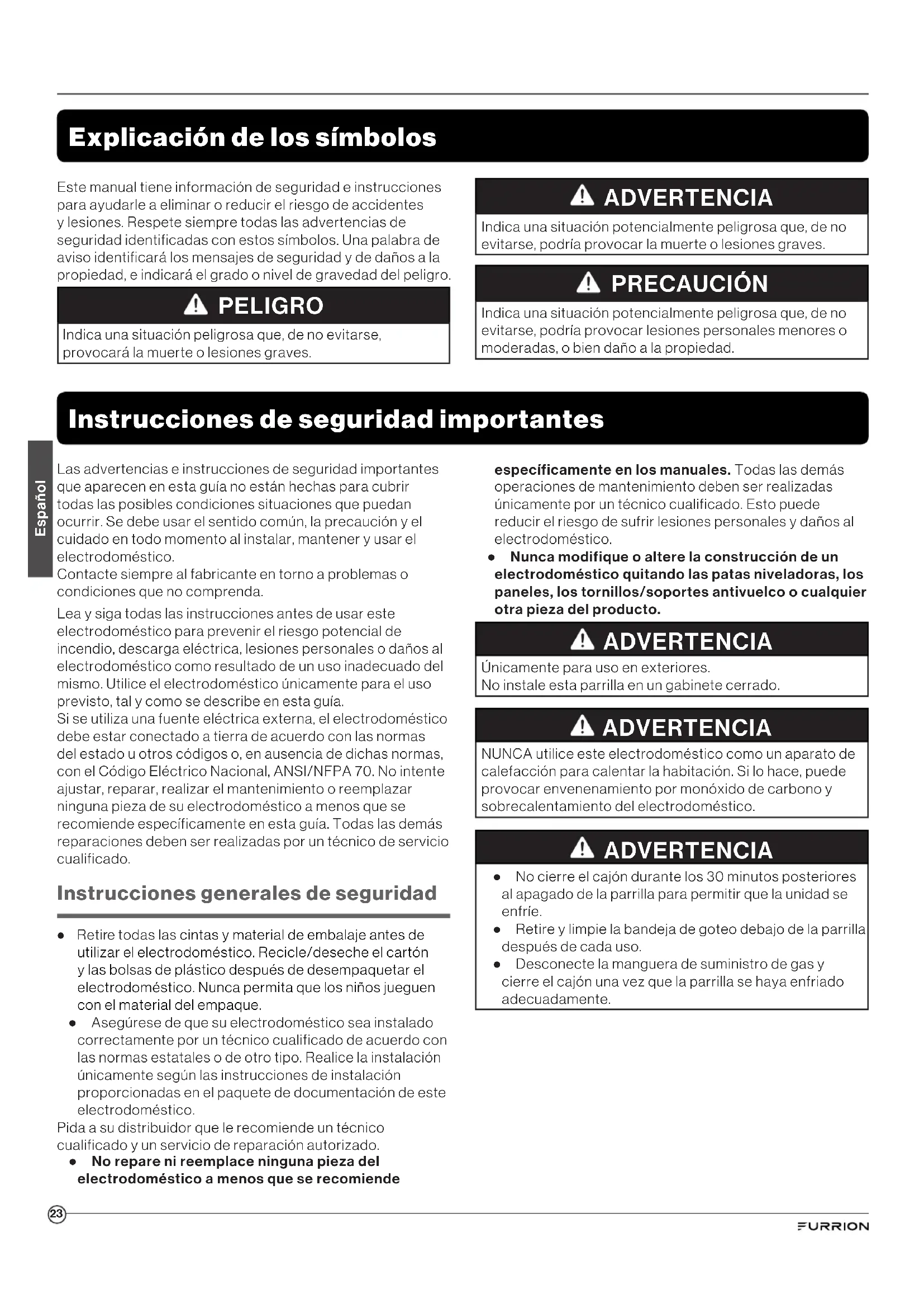 vis. REMARQUE: Assurez-vous que le bord courbé est tourné vers la gauche lors du remplacement du diffuseur de flamme. Bord courbé22 Español Gracias por comprar este producto de Furrion®. Antes de usar su nuevo electrodoméstico, lea atentamente estas instrucciones. Este manual de instrucciones contiene información relativa al uso seguro, a la instalación y al mantenimiento del electrodoméstico. Guarde este manual de instrucciones en un lugar seguro para usarlo como referencia a futuro. Esto garantizará un uso seguro y reducirá el riesgo de lesiones. Asegúrese de entregar este manual a los nuevos propietarios del electrodoméstico. El fabricante no acepta responsabilidad por daños provocados por no seguir estas instrucciones. PELIGRO Si siente olor a gas: