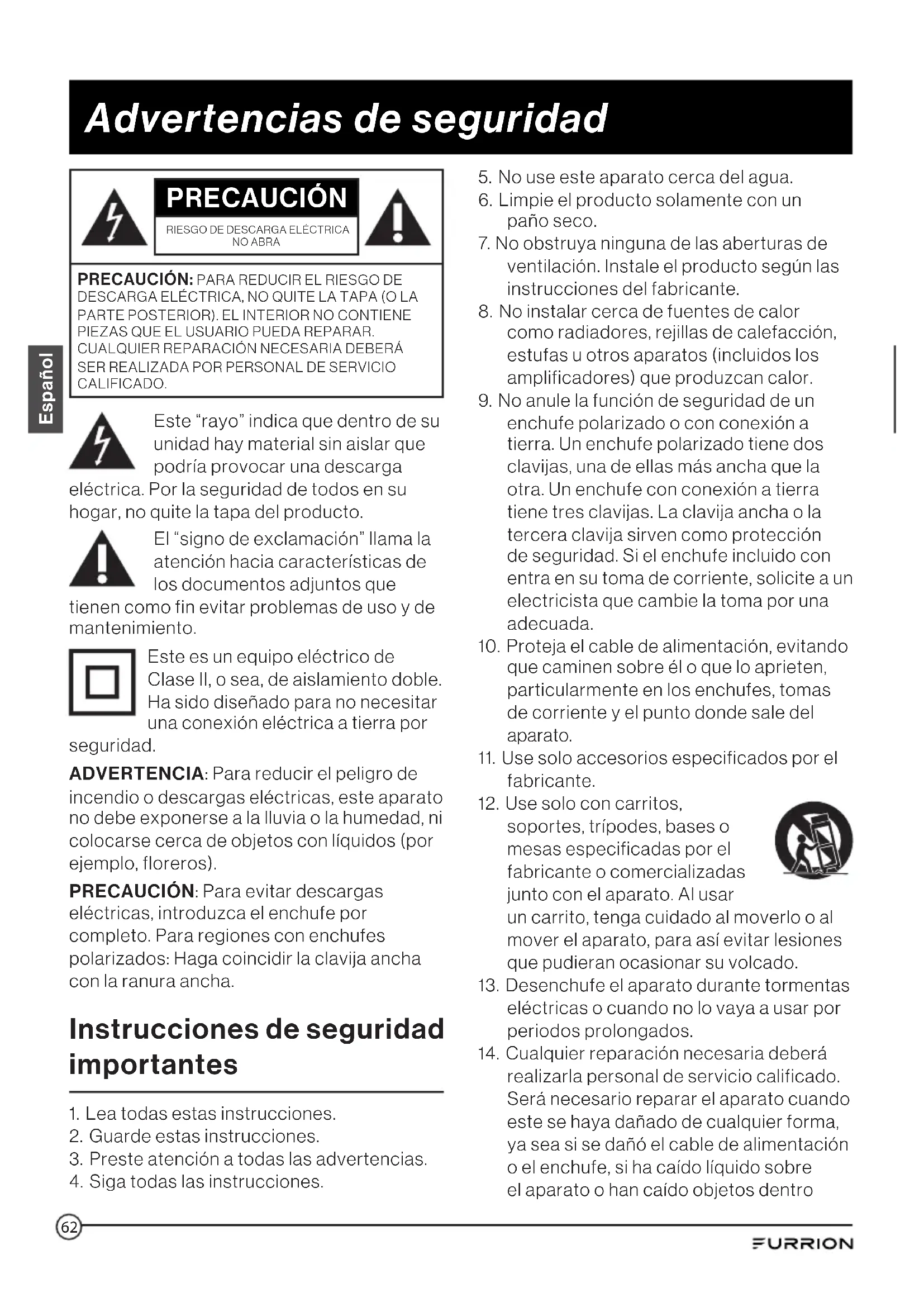 PRECAUCIÓN: PARA REDUCIR EL RIESGO DE DESCARGA ELÉCTRICA, NO QUITE LA TAPA (O LA PARTE POSTERIOR). EL INTERIOR NO CONTIENE PIEZAS QUE EL USUARIO PUEDA REPARAR. CUALQUIER REPARACIÓN NECESARIA DEBERÁ SER REALIZADA POR PERSONAL DE SERVICIO CALIFICADO. Este “rayo” indica que dentro de su unidad hay material sin aislar que podría provocar una descarga eléctrica. Por la seguridad de todos en su hogar, no quite la tapa del producto. El “signo de exclamación” llama la atención hacia características de los documentos adjuntos que tienen como fin evitar problemas de uso y de mantenimiento. Este es un equipo eléctrico de Clase II, o sea, de aislamiento doble. Ha sido diseñado para no necesitar una conexión eléctrica a tierra por seguridad. ADVERTENCIA: Para reducir el peligro de incendio o descargas eléctricas, este aparato no debe exponerse a la lluvia o la humedad, ni colocarse cerca de objetos con líquidos (por ejemplo, floreros). PRECAUCIÓN: Para evitar descargas eléctricas, introduzca el enchufe por completo. Para regiones con enchufes polarizados: Haga coincidir la clavija ancha con la ranura ancha. Instrucciones de seguridad importantes
