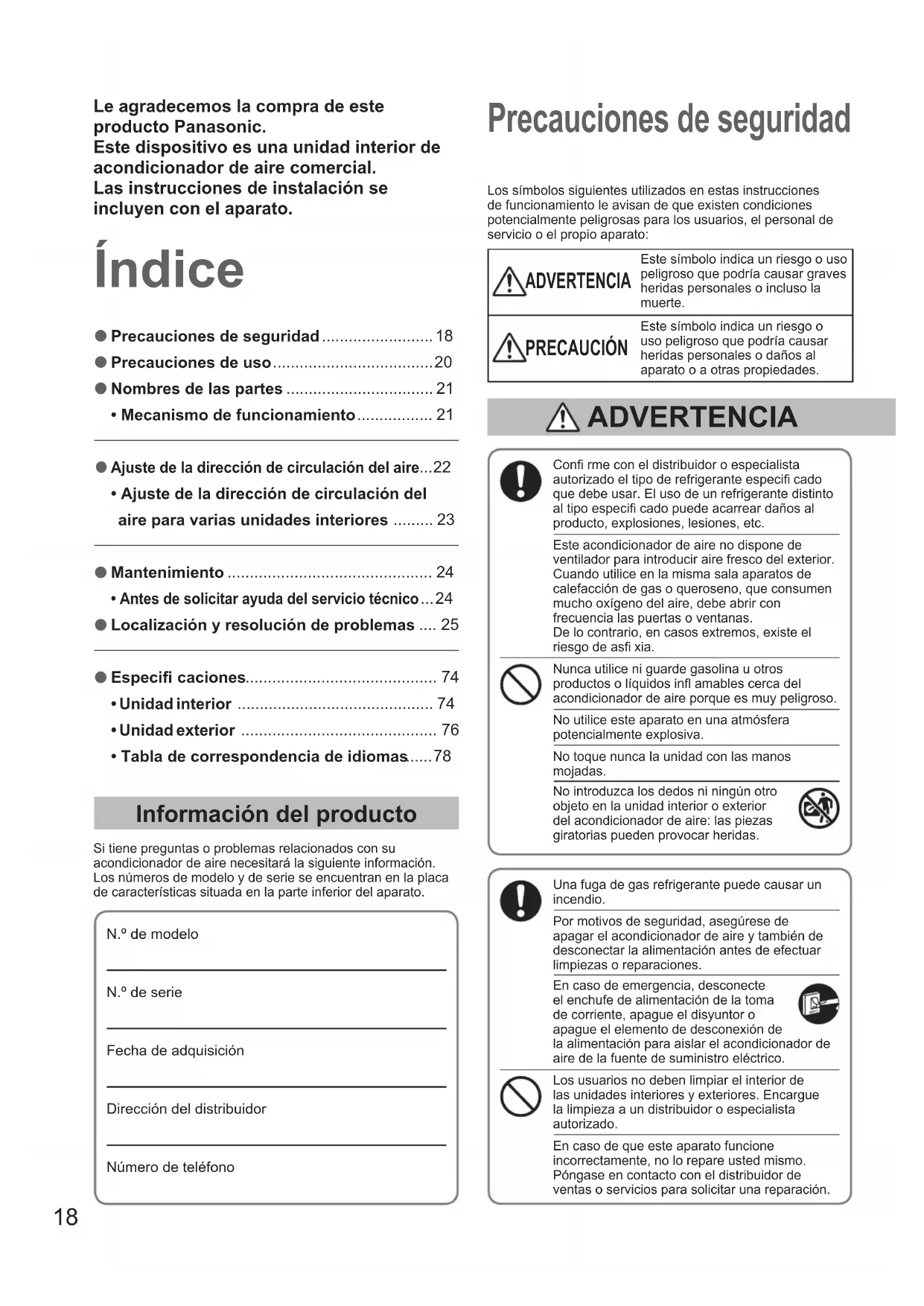 - • Tabla de correspondencia de idiomas Índice Precauciones de seguridad Información del producto Si tiene preguntas o problemas relacionados con su acondicionador de aire necesitará la siguiente información. Los números de modelo y de serie se encuentran en la placa de características situada en la parte inferior del aparato.N.º de modelo N.º de serie Fecha de adquisiciónDirección del distribuidorNúmero de teléfonoConfi rme con el distribuidor o especialista autorizado el tipo de refrigerante especifi cado que debe usar. El uso de un refrigerante distinto al tipo especifi cado puede acarrear daños al producto, explosiones, lesiones, etc.Este acondicionador de aire no dispone de ventilador para introducir aire fresco del exterior. Cuando utilice en la misma sala aparatos de calefacción de gas o queroseno, que consumen mucho oxígeno del aire, debe abrir con frecuencia las puertas o ventanas. De lo contrario, en casos extremos, existe el riesgo de asfi xia.Nunca utilice ni guarde gasolina u otros productos o líquidos infl amables cerca del acondicionador de aire porque es muy peligroso.No utilice este aparato en una atmósfera potencialmente explosiva.No toque nunca la unidad con las manos mojadas.No introduzca los dedos ni ningún otro objeto en la unidad interior o exterior del acondicionador de aire: las piezas giratorias pueden provocar heridas.Una fuga de gas refrigerante puede causar un incendio.Por motivos de seguridad, asegúrese de apagar el acondicionador de aire y también de desconectar la alimentación antes de efectuar limpiezas o reparaciones.En caso de emergencia, desconecte el enchufe de alimentación de la toma de corriente, apague el disyuntor o apague el elemento de desconexión de la alimentación para aislar el acondicionador de aire de la fuente de suministro eléctrico.Los usuarios no deben limpiar el interior de las unidades interiores y exteriores. Encargue la limpieza a un distribuidor o especialista autorizado.En caso de que este aparato funcione incorrectamente, no lo repare usted mismo. Póngase en contacto con el distribuidor de ventas o servicios para solicitar una reparación.Los símbolos siguientes utilizados en estas instrucciones de funcionamiento le avisan de que existen condiciones potencialmente peligrosas para los usuarios, el personal de servicio o el propio aparato: ADVERTENCIA Este símbolo indica un riesgo o uso peligroso que podría causar graves heridas personales o incluso la muerte. PRECAUCIÓN Este símbolo indica un riesgo o uso peligroso que podría causar heridas personales o daños al aparato o a otras propiedades. ADVERTENCIA Le agradecemos la compra de este producto Panasonic.Este dispositivo es una unidad interior de acondicionador de aire comercial.Las instrucciones de instalación se incluyen con el aparato. OI00F569616EU.indb18OI00F569616EU.indb18 2014/02/289:31:082014/02/289:31:0819 ESPAÑOL Este aparato está pensado para ser utilizado por expertos o usuarios con la cualifi cación necesaria en tiendas, en la industria ligera y en granjas, o por no expertos en usos comerciales. Este dispositivo podrá ser utilizado por niños de más de 8 años y por personas con capacidades físicas, sensoriales o mentales reducidas o con falta de experiencia y conocimientos, siempre que estén bajo supervisión o hayan recibido instrucciones relativas al uso seguro del dispositivo y comprendan los riesgos que dicho uso conlleva. Instale la alarma contra incendios y la salida de aire a una distancia mínima de 1,5 m de la unidad. No caliente ni enfríe demasiado la sala si en ella se encuentran bebés o personas discapacitadas. No apague ni encienda el acondicionador de aire con el interruptor de alimentación. Utilice para ello el botón de operación de encendido/apagado (ON/ OFF). No introduzca nada en las salidas de aire de la unidad exterior. Esto es muy peligroso, porque el ventilador gira a alta velocidad. No toque la entrada de aire ni las afi ladas aletas de aluminio de la unidad exterior. Podría hacerse daño. No pegue ningún objeto en la CARCASA DEL VENTILADOR. Podría sufrir lesiones y la unidad podría dañarse. Proporcione una toma de corriente que pueda utilizarse exclusivamente para cada unidad, e instale un disyuntor de circuito, un elemento de desconexión de la alimentación y un disyuntor de fugas a modo de protección contra sobrecorriente en la línea exclusiva. Proporcione una toma de corriente para cada unidad; y en el cableado fi jo deberán incorporarse medios para la desconexión completa del suministro eléctrico que tengan una separación de contacto en todos los polos en conformidad con las normas del cableado. Para prevenir posibles peligros a causa de un fallo en el aislamiento, la unidad debe conectarse a tierra. No utilice cables manipulados, empalmados, prolongados o de origen desconocido, para evitar sobrecalentamientos y riesgo de incendios. Deje de utilizar el producto cuando haya cualquier anormalidad/fallo y desconecte el cable de corriente o desactive el interruptor de alimentación y el interruptor. (Riesgo de humo/incendio/descarga eléctrica) Ejemplos de anormalidad o fallo: p. 78