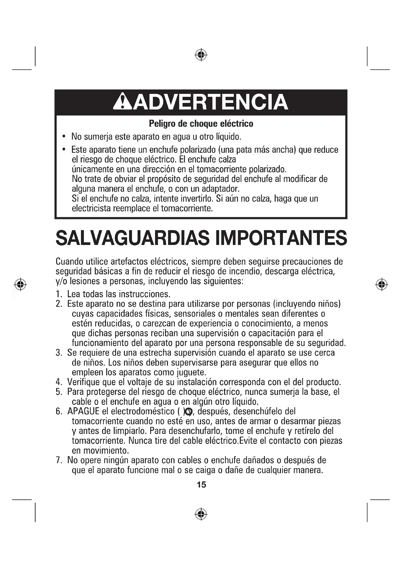 SALVAGUARDIAS IMPORTANTES Cuando utilice artefactos eléctricos, siempre deben seguirse precauciones de seguridad básicas a fin de reducir el riesgo de incendio, descarga eléctrica, y/o lesiones a personas, incluyendo las siguientes: