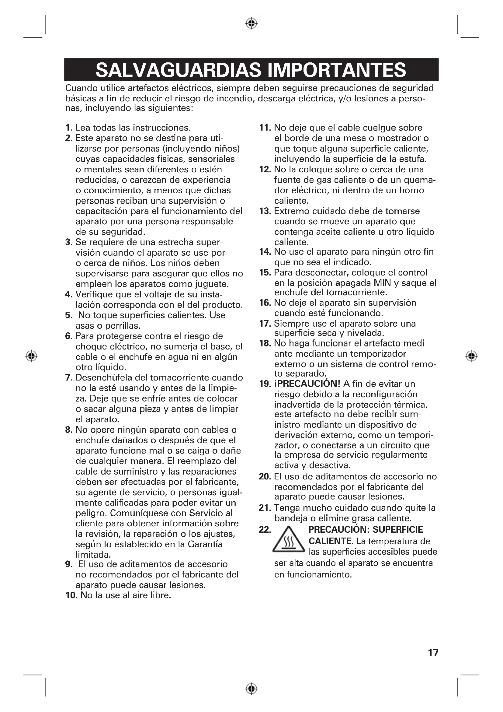 CALIENTE. La temperatura de las superficies accesibles puede ser alta cuando el aparato se encuentra en funcionamiento.18 Otra Información de Seguridad para el Cliente ¡GUARDE ESTAS INSTRUCCIONES! Este aparato ha sido diseñado solamente para uso doméstico w ADVERTENCIA Peligro de Descarga Eléctrica: Este producto es provisto con un enchufe polarizado (una pata más ancha) para reducir el riesgo de una descarga eléctrica. El enchufe embona únicamente en una dirección dentro de un tomacorriente polarizado. No trate de obviar el propósito de seguridad del enchufe modificándolo de alguna manera o utilizando un adaptador. Si el enchufe no entra completamente en la toma, invierta el enchufe. Si aún no entra, haga que un electricista reemplace la toma. El largo del cable que se usa en este aparato fue seleccionado para reducir el peligro de que alguien se enganche o tropiece con un cable más largo. Si es necesario usar un cable más largo, se podrá usar un cable de extensión aprobado. La clasificación eléctrica nominal del cable de extensión debe ser igual o mayor que la clasificación nominal del aparato. Es importante tener cuidado de colocar el cable de extensión para que no se pliegue sobre el mostrador o la mesera en donde niños puedan tirar del mismo o tropezarse accidentalmente. Para evitar una sobrecarga eléctrica del circuito, no use otro aparato de alto voltaje en el mismo circuito con este aparato.19