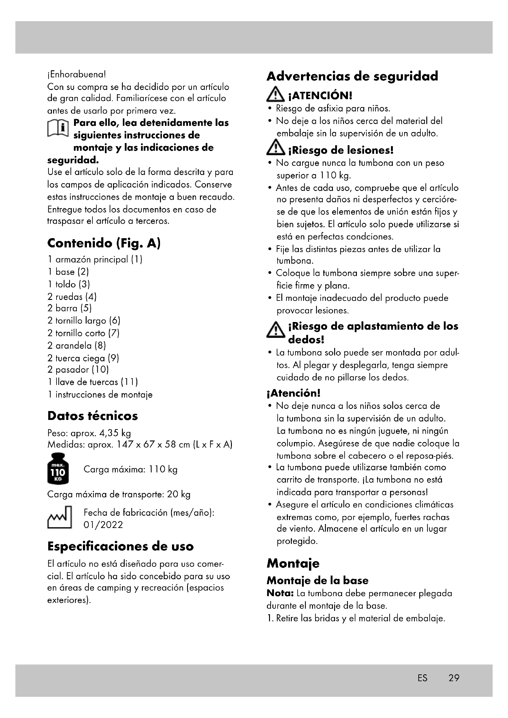 Carga máxima: 110 kg Carga máxima de transporte: 20 kg Fecha de fabricación (mes/año): 01/2022 Especificaciones de uso El artículo no está diseñado para uso comer- cial. El artículo ha sido concebido para su uso en áreas de camping y recreación (espacios exteriores).30 ES