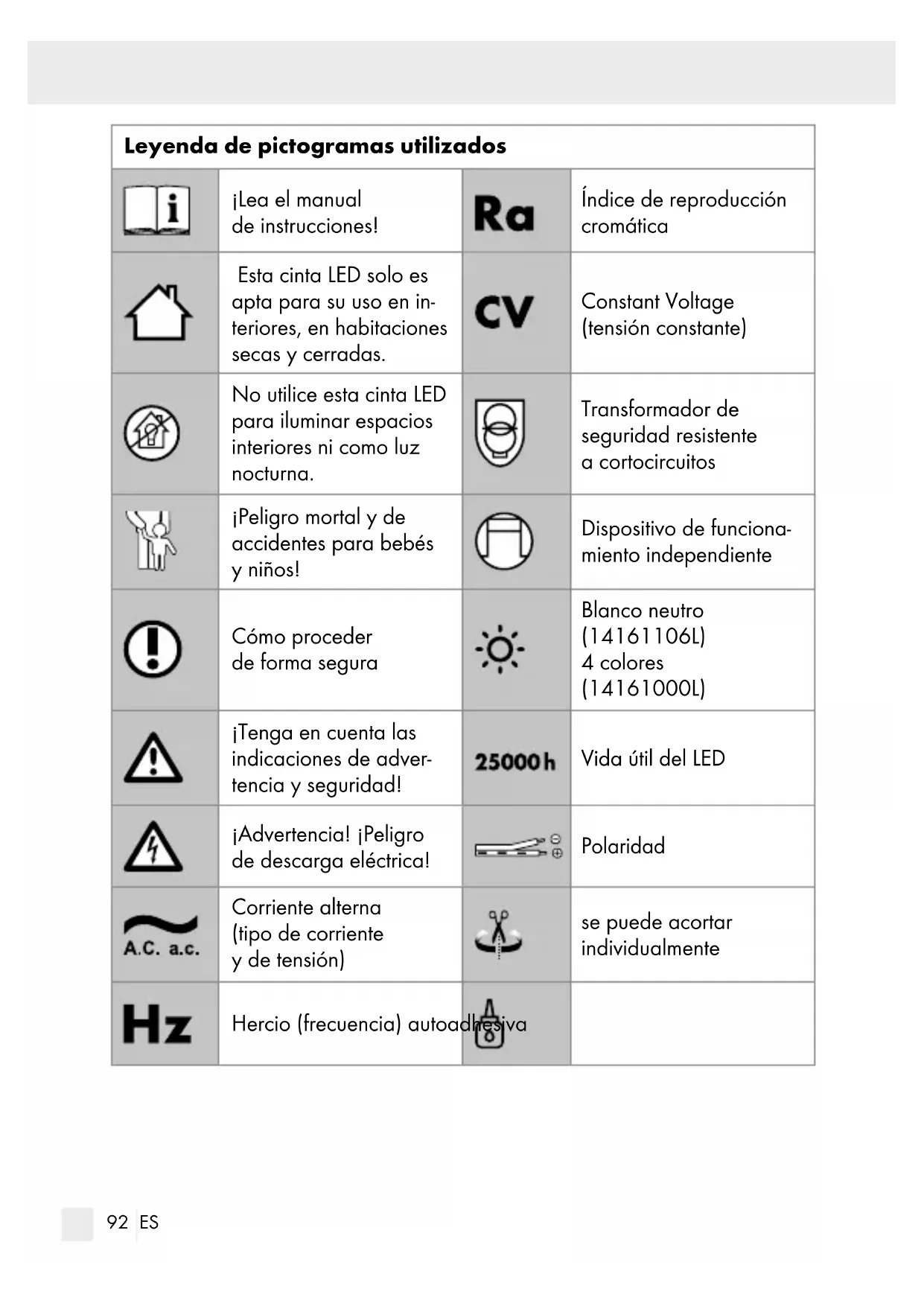 používajte suchú handričku, ktorá nepúšťa vlákna. Likvidácia Obal pozostáva z ekologických materiálov, ktoré môžete odovzdať na miestnych recyklačných zberných miestach. Všímajte si prosím označenie obalových materiálov pre triedenie odpadu, sú označené skratkami (a) a číslami (b) s nasledujúcim významom: 1–7: Plasty/20–22: Papier a kartón/80–98: Spojené látky. Výrobok a obalové materiály sú recyklovateľné, zlikvidujte ich oddelene pre lepšie spracovanie odpadu. Triman-Logo platí iba pre Francúzsko. Ak výrobok doslúžil, v záujme ochrany životného prostredia ho neod- hoďte do domového odpadu, ale odovzdajte na odbornú likvidáciu. Informácie o zberných miestach a ich otváracích hodinách získate na Vašej príslušnej správe. Informácie Záruka Na tento prístroj poskytujeme záruku 36 mesiacov od dátumu kúpy. Prístroj bol starostlivo vyrobený a podrobený dôkladnej kontrole kvality. Vrámci záručnej doby bezplatne opravíme všetky chyby materiálu a výrobné chyby. Ak by sa však počas záručnej doby vyskytli nedostatky, odošlite prístroj na uvedenú servisnú adresu s uvedením nasledujúceho čísla modelu: 14161000L/14161106L.89 SK Zo záruky sú vylúčené škody spôsobené neodbornou manipuláciou, nedodržaním návodu na obsluhu alebo zásahom neautorizovanej osoby, ako aj diely podlie- hajúce opotrebovaniu (napr. osvetľovacie prostriedky). Poskytnutím záruky sa záručná doba nepredlžuje ani neobnovuje. Servis Briloner Leuchten GmbH & Co. KG Im Kissen 2 59929 Brilon NEMECKO Tel.: +49 29 61/97 12–800 Fax: +49 29 61/97 12–199 E-mail: kundenservice@briloner.com www.briloner.com Bezplatné servisné číslo: Tel.: 00800/27456637 IAN 380114_2110 Pre všetky otázky majte pripravený pokladničný doklad a číslo výrobku (IAN 380114_2110) ako dôkaz o kúpe. Konformitné vyhlásenie Tento výrobok spĺňa požiadavky platných európskych a národných smerníc. Konformita bola preukázaná. Príslušné prehlásenia a podklady sú uložené u výrobcu. Výrobca Briloner Leuchten GmbH & Co. KG Im Kissen 2 59929 Brilon NEMECKO9091 ES Leyenda de pictogramas utilizados .....................Página 92 Introducción................................................................................Página 94 Uso adecuado .................................................................................. Página 94 Contenido .........................................................................................Página 95 Descripción de las piezas ................................................................ Página 95 Datos técnicos ...................................................................................Página 95 Seguridad .....................................................................................Página 96 Indicaciones de seguridad ...............................................................Página 96 Puesta en funcionamiento .............................................Página 98 Acortar o unir la cinta de luz LED ....................................................Página 98 Montar la cinta de luz LED ............................................. Página 99 Mantenimiento y limpieza ............................................ Página 100 Desecho del producto ........................................................Página 100 Garantía y servicio técnico ........................................... Página 101 Garantía ............................................................................................Página 101 Dirección del servicio técnico ..........................................................Página 101 Declaración de conformidad ...........................................................Página 102 Fabricante .........................................................................................Página 10292 ES Leyenda de pictogramas utilizados ¡Lea el manual de instrucciones! Índice de reproducción cromática Esta cinta LED solo es apta para su uso en in- teriores, en habitaciones secas y cerradas. Constant Voltage (tensión constante) No utilice esta cinta LED para iluminar espacios interiores ni como luz nocturna. Transformador de seguridad resistente a cortocircuitos ¡Peligro mortal y de accidentes para bebés y niños! Dispositivo de funciona- miento independiente Cómo proceder de forma segura Blanco neutro (14161106L) 4 colores (14161000L) ¡Tenga en cuenta las indicaciones de adver- tencia y seguridad! Vida útil del LED ¡Advertencia! ¡Peligro de descarga eléctrica! Polaridad Corriente alterna (tipo de corriente y de tensión) se puede acortar individualmente Hercio (frecuencia) autoadhesiva93 ES Leyenda de pictogramas utilizados Vatio (potencia real) Esta lámpara no está diseñada para utilizarse con interruptores electró- nicos ni con reguladores externos. Voltio Amperio 14161106L: Para evitar riesgos, si la unidad de funcionamiento de este producto se estropea, deberá ser reemplazada únicamente por el fabri- cante, su distribuidor o personal técnico equiva- lente. 14161106L: Para evitar riesgos, si el foco de luz del producto se estropea, este deberá ser reemplazado única- mente por el fabricante, su distribuidor o perso- nal técnico equivalente. Clase de protección II Temperatura lumínica en kelvin Corriente continua (tipo de corriente y de tensión) El embalaje está compuesto por papel 100 % reciclado. Tensión baja de seguridad ¡Deseche el embalaje y el aparato de forma respetuosa con el medioambiente! Miliamperio Polietileno (densidad baja)94 ES Leyenda de pictogramas utilizados Esta lámpara cuenta con un tipo de protección «IP20» y únicamente se recomienda su uso en espacios interiores de hogares. Otros plásticos como policarbonato (PC), poliamida (PA), acriloni- trilo butadieno estireno (ABS), polimetilmetacri- lato (PMMA), ácido poliláctico (PLA), entre otros. Temperatura ambiental Cartón ondulado Tem