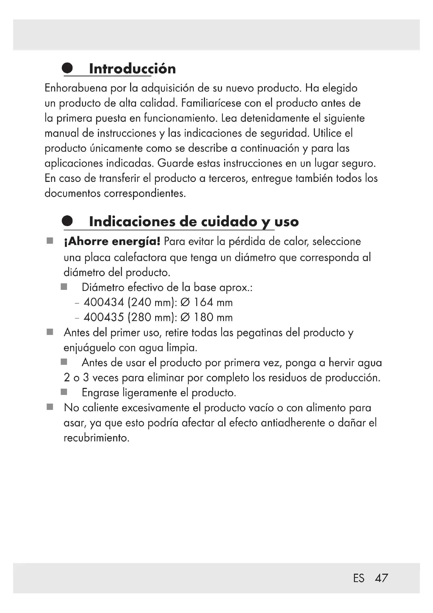 Introducción Enhorabuena por la adquisición de su nuevo producto. Ha elegido un producto de alta calidad. Familiarícese con el producto antes de la primera puesta en funcionamiento. Lea detenidamente el siguiente manual de instrucciones y las indicaciones de seguridad. Utilice el producto únicamente como se describe a continuación y para las aplicaciones indicadas. Guarde estas instrucciones en un lugar seguro. En caso de transferir el producto a terceros, entregue también todos los documentos correspondientes. Indicaciones de cuidado y uso ¡Ahorre energía! Para evitar la pérdida de calor, seleccione una placa calefactora que tenga un diámetro que corresponda al diámetro del producto. Diámetro efectivo de la base aprox.: – 400434(240mm): Ø 164mm – 400435(280mm): Ø 180mm Antes del primer uso, retire todas las pegatinas del producto y enjuáguelo con agua limpia. Antes de usar el producto por primera vez, ponga a hervir agua 2o3veces para eliminar por completo los residuos de producción. Engrase ligeramente el producto. No caliente excesivamente el producto vacío o con alimento para asar, ya que esto podría afectar al efecto antiadherente o dañar el recubrimiento.48 ES ¡Peligro de sobrecalentamiento! Si el utensilio de cocina no está engrasado y se calienta excesivamente, al ocurrir el contacto con alimentos sin grasa las proteínas presentes en los alimentos se quemarían, lo que puede causar la decoloración de la capa antiadherente. Estas decoloraciones se consideran como marcas de uso y no afectan a la calidad del recubrimiento ni a su idoneidad para el uso. Caliente la comida a fuego alto/ medio inicialmente y déjela después a fuego lento hasta terminar la cocción. No deje el producto sin vigilancia cuando se caliente la grasa: La grasa sobrecalentada puede incendiarse. ¡Jamás apague la grasa ardiendo con agua! Apague las llamas con una tapa o una manta densa. Utilice solamente utensilios de cocina de plástico o madera, para no dañar la capa antiadherente. No corte el alimento directamente en el producto. No coloque carne demasiado húmeda en el producto. Las salpicaduras de grasa sobre una placa de cocina incandescente pueden provocar un incendio. El mango de la sartén puede calentarse durante la cocción. Para su protección, use un trapo de cocina o guantes de horno. El producto es adecuado para cocinas de gas, eléctricas, vitrocerámica, de inducción y de superficies halógenas.49ES Nota para las placas de inducción: En determinadas circunstancias puede escucharse un ruido que es debido a las propiedades electromagnéticas de la fuente de calor y del producto. Esto es normal y no hace referencia a un defecto de su placa de inducción o del producto. El producto debe colocarse en el centro de la placa de inducción. ¡ATENCIÓN! ¡Alta velocidad de calentamiento! No sobrecalentar el producto durante el precalentamiento. En caso de sobrecalentamiento del producto, debe airearse bien el espacio. Este producto combina las ventajas de los utensilios de cocina de aluminio, como el bajo peso y la alta conductividad térmica, con las ventajas de la cocina con inducción. Para posibilitar esto, elementos de acero magnéticos fueron insertados en la base de aluminio. Por ello el fondo no es siempre magnético, y puede no responder en aquellas placas de inducción, que significativamente excedan el diámetro de la base. Esto no es un defecto de calidad y no interfiere en el funcionamiento. Para que el producto funcione correctamente, colóquelo siempre sobre una placa de cocción que corresponda al diámetro efectivo de la base indicado en este manual de instrucciones. Las altas temperaturas pueden decolorar la parte exterior del producto. Esto no es ningún defecto de material y no afecta a la calidad o funcionalidad del producto. Nunca ponga el producto caliente bajo un chorro de agua fría. La parte inferior del producto podría dañarse o despegarse del producto.50 ES El producto es apropiado para mantener caliente los alimentos en el horno (máx.160°C durante1hora). Este producto es apto para lavavajillas. Para la limpieza manual, utilice agua caliente y un detergente lavavajillas común. Evite el uso de objetos afilados, puntiagudos o de cepillos, para no dañar el material. No use productos abrasivos para limpiar. La limpieza frecuente con productos de limpieza abrasivos puede dañar y/o decolorar el producto. La limpieza en el lavavajillas puede causar decoloración de las piezas de aluminio. ¡ATENCIÓN! ¡ARAÑAZOS! ¡Evite las rozaduras del producto sobre vitrocerámicas! Antes de empezar a cocinar, le recomendamos que limpie la superficie de la placa de cocción y el fondo del producto con un paño limpio y sin pelusas (por ejemplo, microfibra). Así puede evitar arañazos. Seguridad alimentaria: Este producto no influye ni en el sabor ni en el olor de los alimentos preparados. No utilice el producto si el mango está suelto. Si es necesario vuelva a apretar la atornilladura del mango. Eliminación El embalaje está compuesto por materiales no contaminantes que pueden ser desechados en el centro de reciclaje local. Para obtener información sobre las posibilidades de desecho del producto al final de su vida útil, acuda a la administración de su comunidad o ciudad.51ES Garantía El producto ha sido fabricado cuidadosamente siguiendo exigentes normas de calidad y ha sido probado antes de su entrega. En caso de defecto del producto, usted tiene derechos legales frente al vendedor del mismo. Nuestra garantía (abajo indicada) no supone una restricción de dichos derechos legales. Este producto dispone de una garantía de 3 años desde la fecha de compra. El plazo de garantía comienza a partir de la fecha de compra. Por favor, conserve adecuadamente el justificante de compra original. Este documento se requerirá como prueba de que se realizó la compra. Si en el plazo de 3 años a partir de la fecha de compra se produce un fallo de material o fa