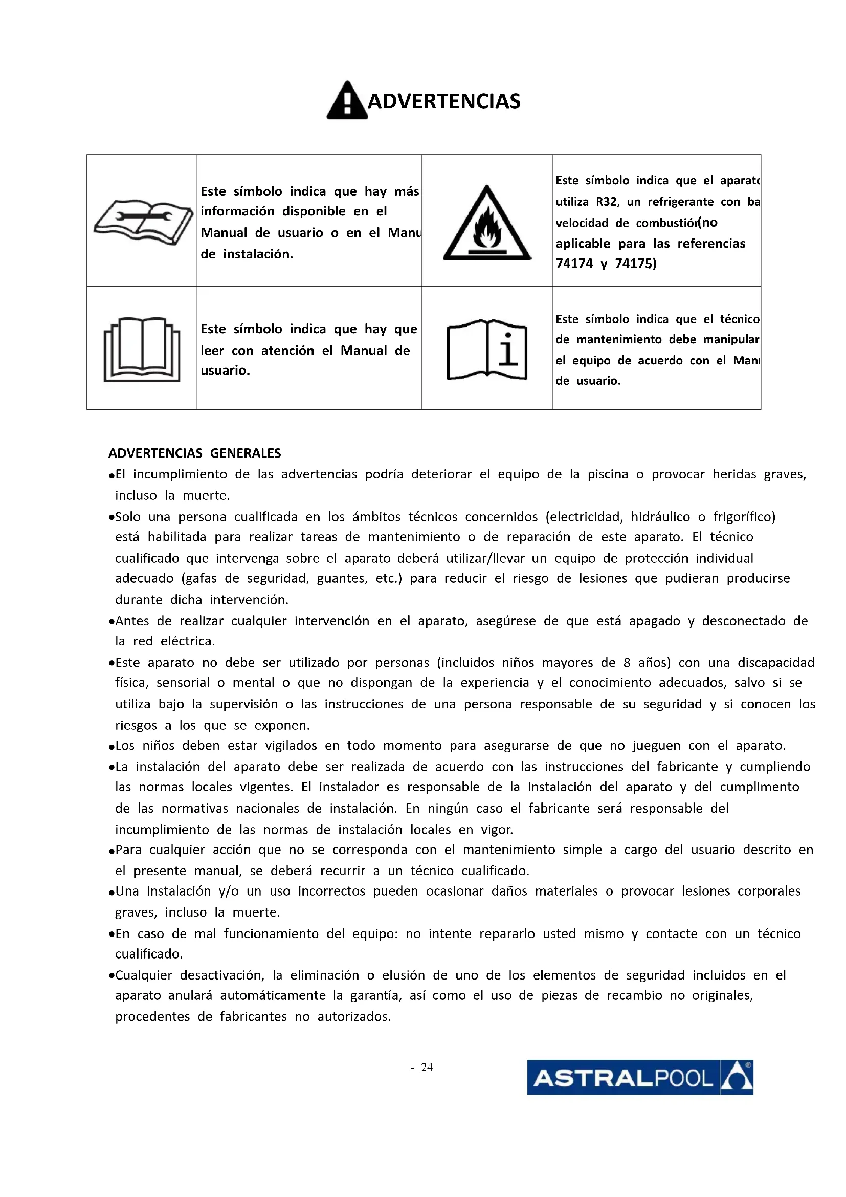 El incumplimiento de las advertencias podría deteriorar el equipo de la piscina o provocar heridas graves, incluso la muerte.
