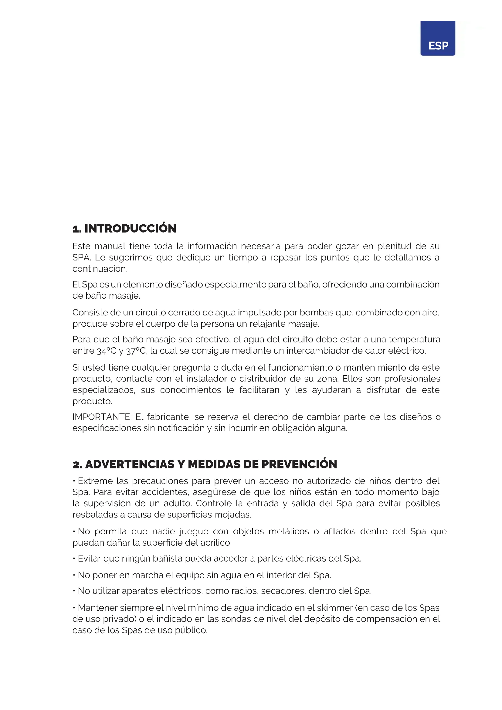 Este manual tiene toda la información necesaria para poder gozar en plenitud de su SPA. Le sugerimos que dedique un tiempo a repasar los puntos que le detallamos a continuación. El Spa es un elemento diseñado especialmente para el baño, ofreciendo una combinación de baño masaje. Consiste de un circuito cerrado de agua impulsado por bombas que, combinado con aire, produce sobre el cuerpo de la persona un relajante masaje. Para que el baño masaje sea efectivo, el agua del circuito debe estar a una temperatura entre 34ºC y 37ºC, la cual se consigue mediante un intercambiador de calor eléctrico. Si usted tiene cualquier pregunta o duda en el funcionamiento o mantenimiento de este producto, contacte con el instalador o distribuidor de su zona. Ellos son profesionales especializados, sus conocimientos le facilitaran y les ayudaran a disfrutar de este producto. IMPORTANTE: El fabricante, se reserva el derecho de cambiar parte de los diseños o especicaciones sin noticación y sin incurrir en obligación alguna.