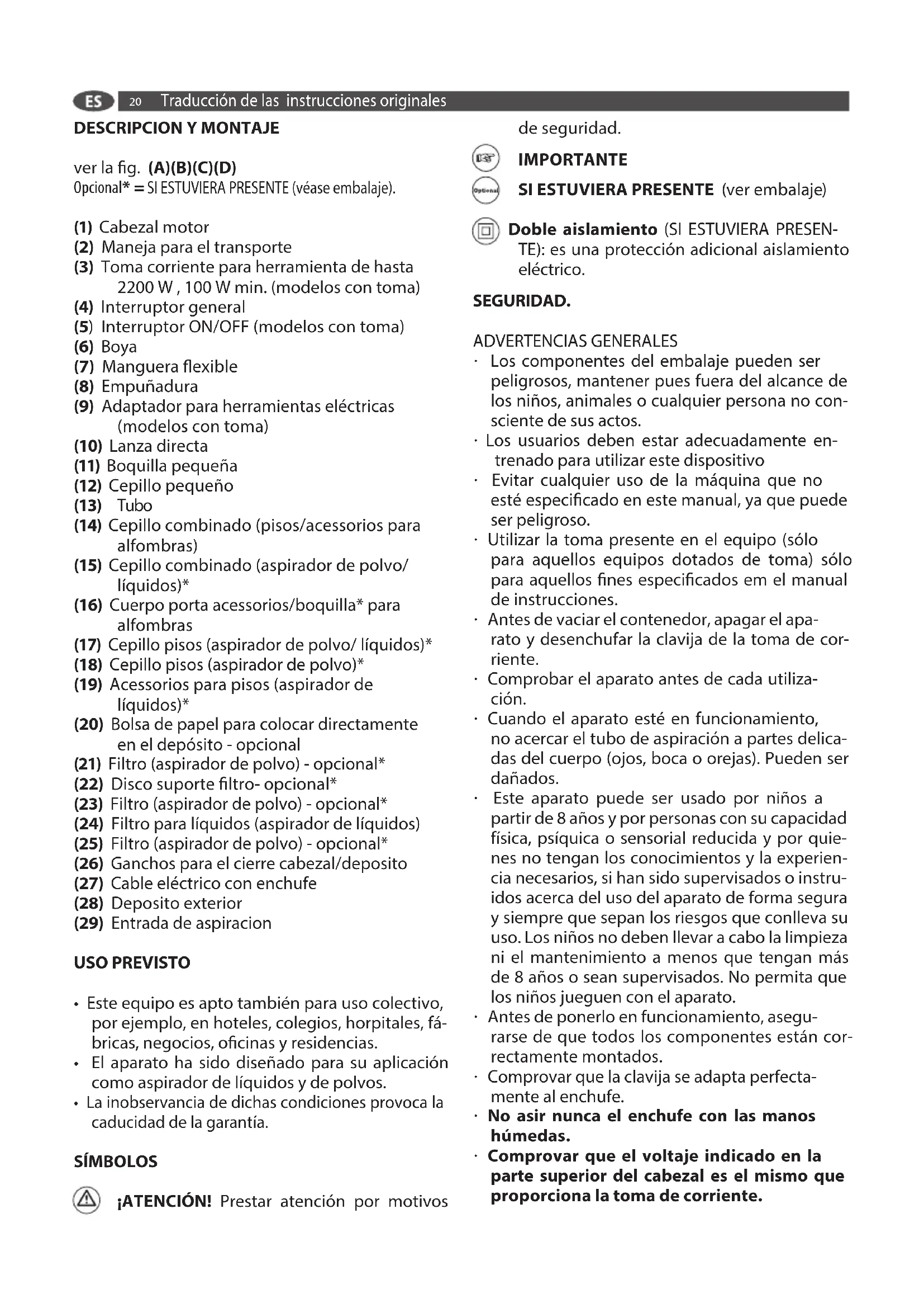 ver la g. (A)(B)(C)(D) Opcional* = SI ESTUVIERA PRESENTE (véase embalaje). (1) Cabezal motor (2) Maneja para el transporte (3) Toma corriente para herramienta de hasta 2200 W , 100 W min. (modelos con toma) (4) Interruptor general (5) Interruptor ON/OFF (modelos con toma) (6) Boya (7) Manguera exible (8) Empuñadura (9) Adaptador para herramientas eléctricas (modelos con toma) (10) Lanza directa (11) Boquilla pequeña (12) Cepillo pequeño (13) Tubo (14) Cepillo combinado (pisos/acessorios para alfombras) (15) Cepillo combinado (aspirador de polvo/ líquidos)* (16) Cuerpo porta acessorios/boquilla* para alfombras (17) Cepillo pisos (aspirador de polvo/ líquidos)* (18) Cepillo pisos (aspirador de polvo)* (19) Acessorios para pisos (aspirador de líquidos)* (20) Bolsa de papel para colocar directamente en el depósito - opcional (21) Filtro (aspirador de polvo) - opcional* (22) Disco suporte ltro- opcional* (23) Filtro (aspirador de polvo) - opcional* (24) Filtro para líquidos (aspirador de líquidos) (25) Filtro (aspirador de polvo) - opcional* (26) Ganchos para el cierre cabezal/deposito (27) Cable eléctrico con enchufe (28) Deposito exterior (29) Entrada de aspiracion USO PREVISTO