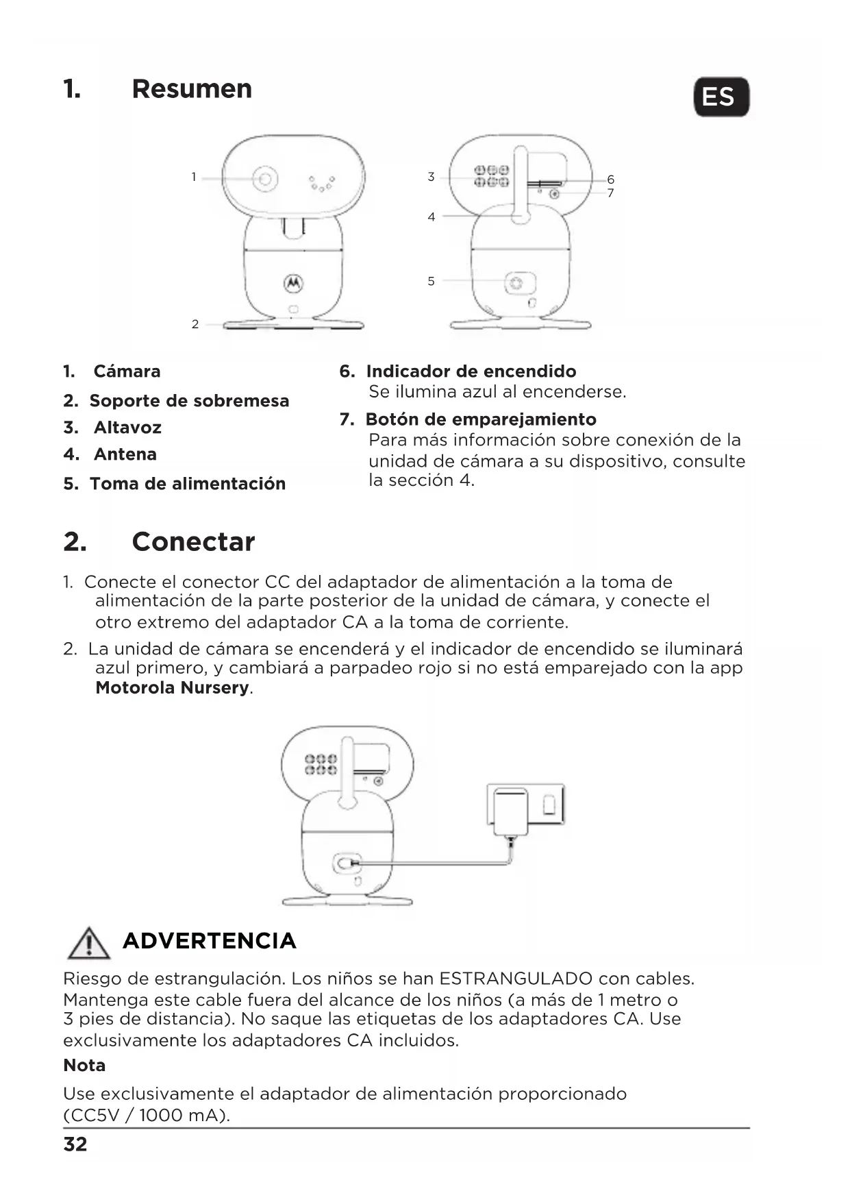 azul primero, y cambiará a parpadeo rojo si no está emparejado con la app Motorola Nursery. ADVERTENCIA Riesgo de estrangulación. Los niños se han ESTRANGULADO con cables. Mantenga este cable fuera del alcance de los niños (a más de 1 metro o 3 pies de distancia). No saque las etiquetas de los adaptadores CA. Use exclusivamente los adaptadores CA incluidos. Nota Use exclusivamente el adaptador de alimentación proporcionado (CC5V / 1000 mA).