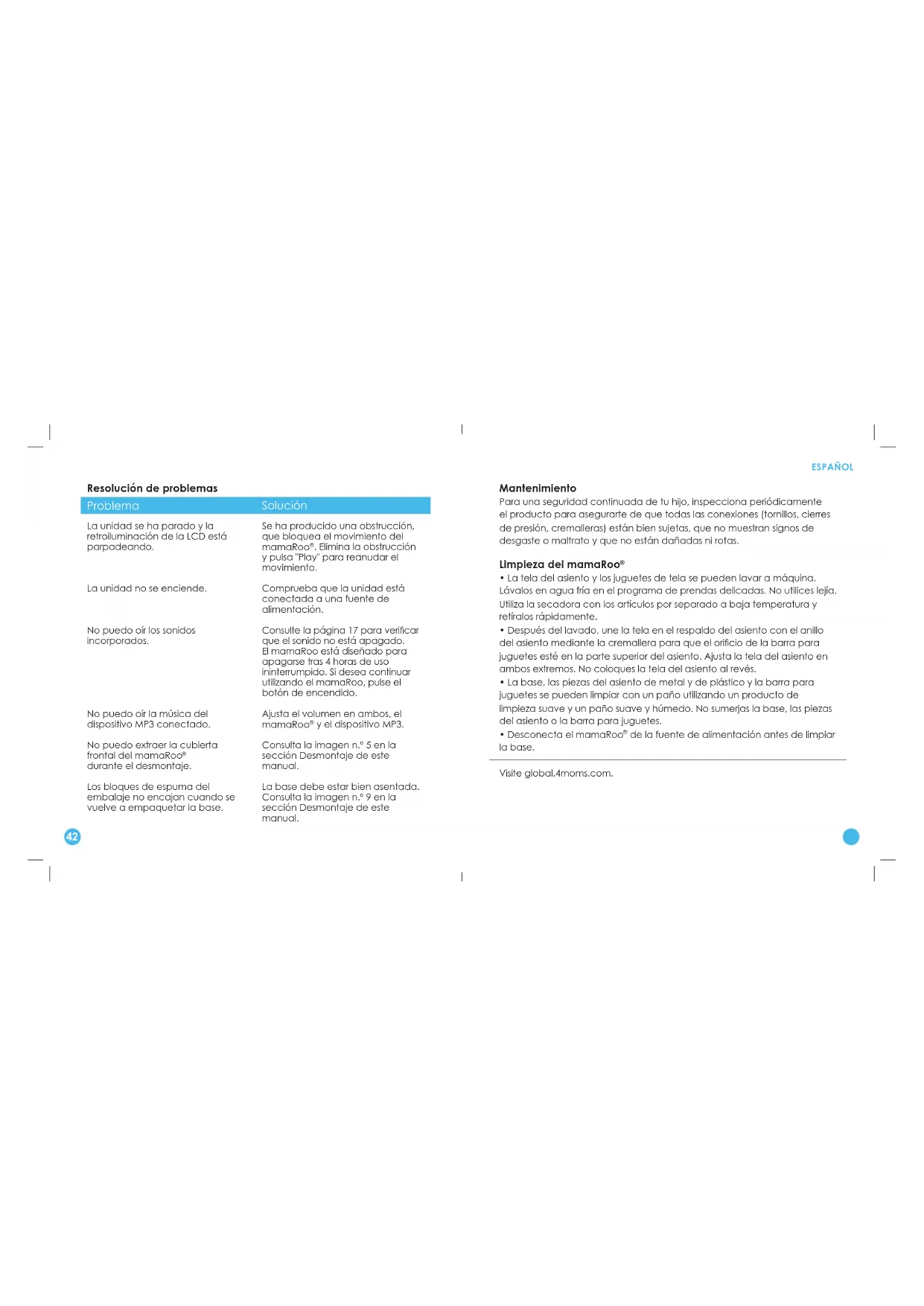 durante el desmontaje. Los bloques de espuma del embalaje no encajan cuando se vuelve a empaquetar la base. Problema Solución Resolución de problemas Mantenimiento Para una seguridad continuada de tu hijo, inspecciona periódicamente el producto para asegurarte de que todas las conexiones (tornillos, cierres de presión, cremalleras) están bien sujetas, que no muestran signos de desgaste o maltrato y que no están dañadas ni rotas. Limpieza del mamaRoo