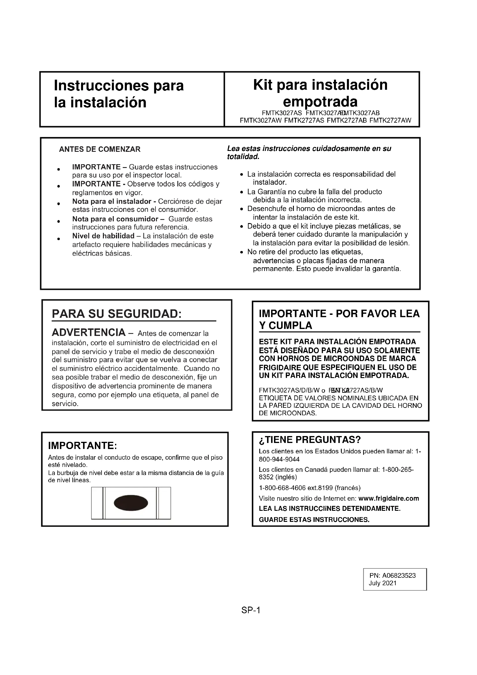 ESTE KIT PARA INSTALLACION EMPOTRADA ESTA DIENADO PARA SU USO SOLAMENTE CON HORNOS DE MICROONDAS DE MARCA FRIGIDAIRE QUE ESPECIFQUEN EL USO DE UN KIT PARA INSTALACION EMPOTRADA.