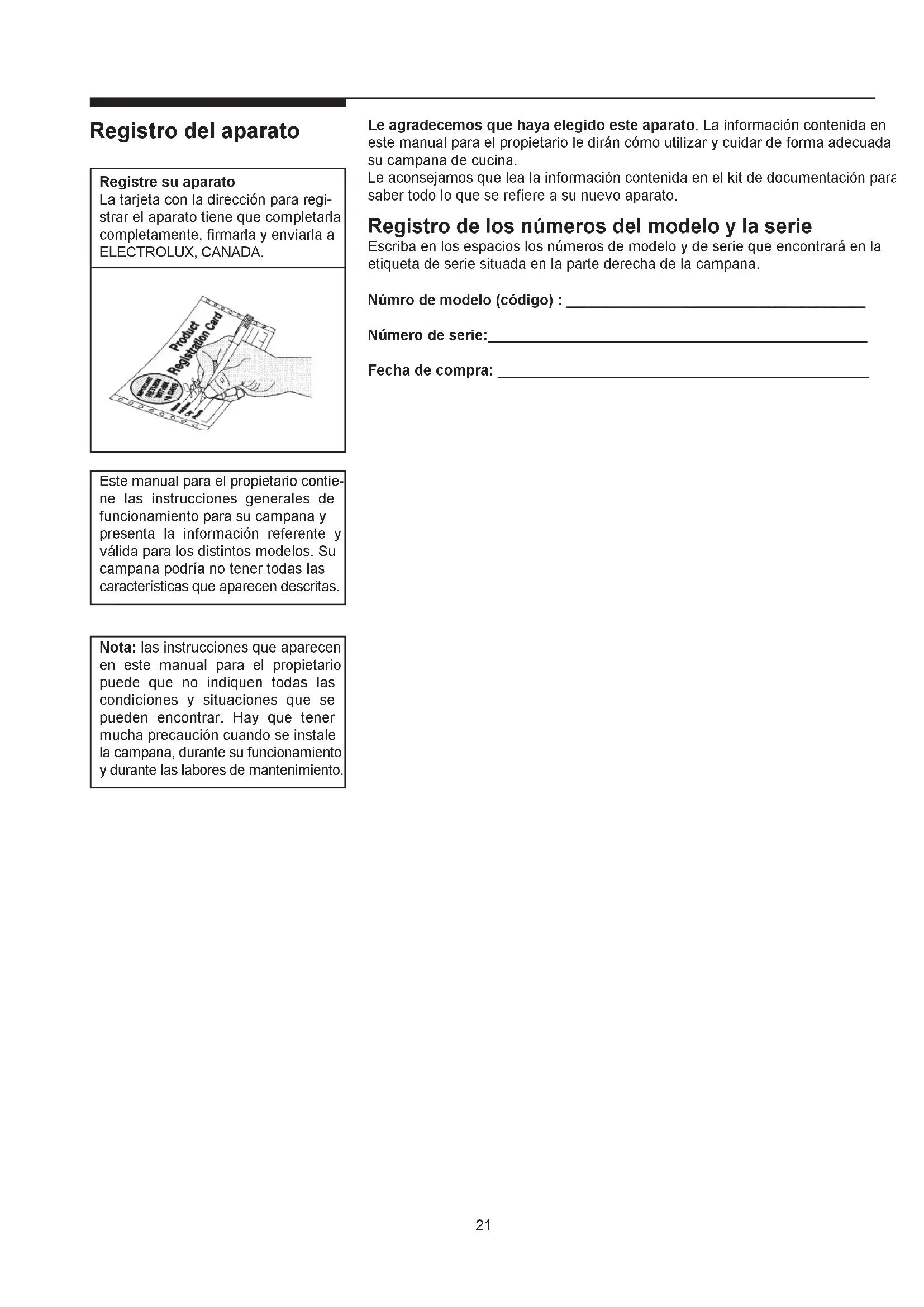 LACHETEUR. Périodes indiquées ci-dessus Paiement des frais de déplacement et dintervention du technicien au domicile de lacheteur ainsi que les frais de retrait et de livraison de lappareil pour le service après- vente. Couverture des frais sur la base des clauses des garanties totales et limitées mentionnées ci-dessus et des exclusions de garantie indiquées ci-dessous.21 Registro del aparato Registre su aparato La tarjeta con la dirección para regi- strar el aparato tiene que completarla completamente, firmarla y enviarla a ELECTROLUX, CANADA. Este manual para el propietario contie- ne las instrucciones generales de funcionamiento para su campana y presenta la información referente y válida para los distintos modelos. Su campana podría no tener todas las características que aparecen descritas. Nota: las instrucciones que aparecen en este manual para el propietario puede que no indiquen todas las condiciones y situaciones que se pueden encontrar. Hay que tener mucha precaución cuando se instale la campana, durante su funcionamiento y durante las labores de mantenimiento. Le agradecemos que haya elegido este aparato. La información contenida en este manual para el propietario le dirán cómo utilizar y cuidar de forma adecuada su campana de cucina. Le aconsejamos que lea la información contenida en el kit de documentación para saber todo lo que se refiere a su nuevo aparato. Registro de los números del modelo y la serie Escriba en los espacios los números de modelo y de serie que encontrará en la etiqueta de serie situada en la parte derecha de la campana. Númro de modelo (código) : _____________________________________ Número de serie:_______________________________________________ Fecha de compra: ______________________________________________22 Instrucciones muy importantes para la seguridad
