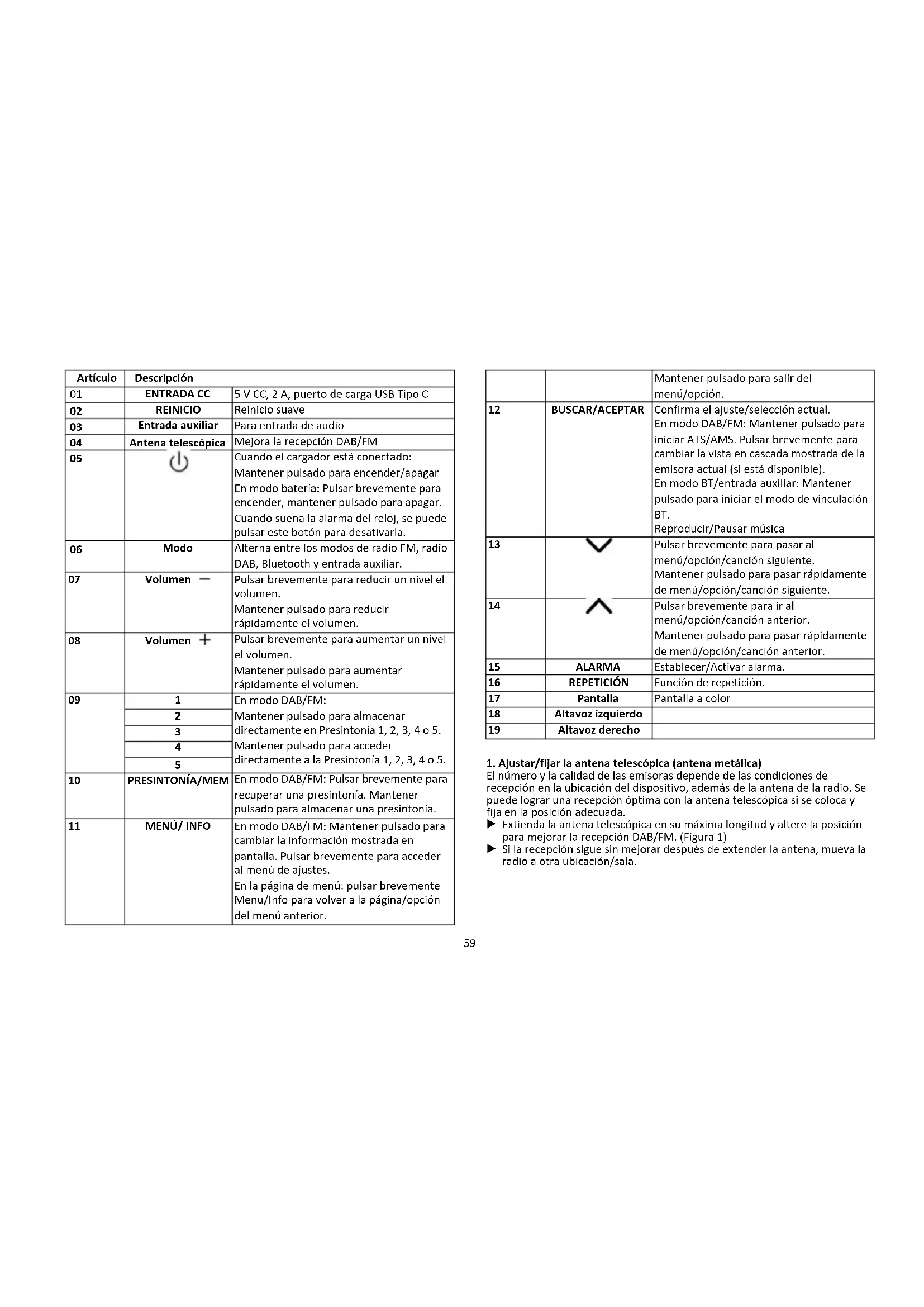 El número y la calidad de las emisoras depende de las condiciones de recepción en la ubicación del dispositivo, además de la antena de la radio. Se puede lograr una recepción óptima con la antena telescópica si se coloca y fija en la posición adecuada.