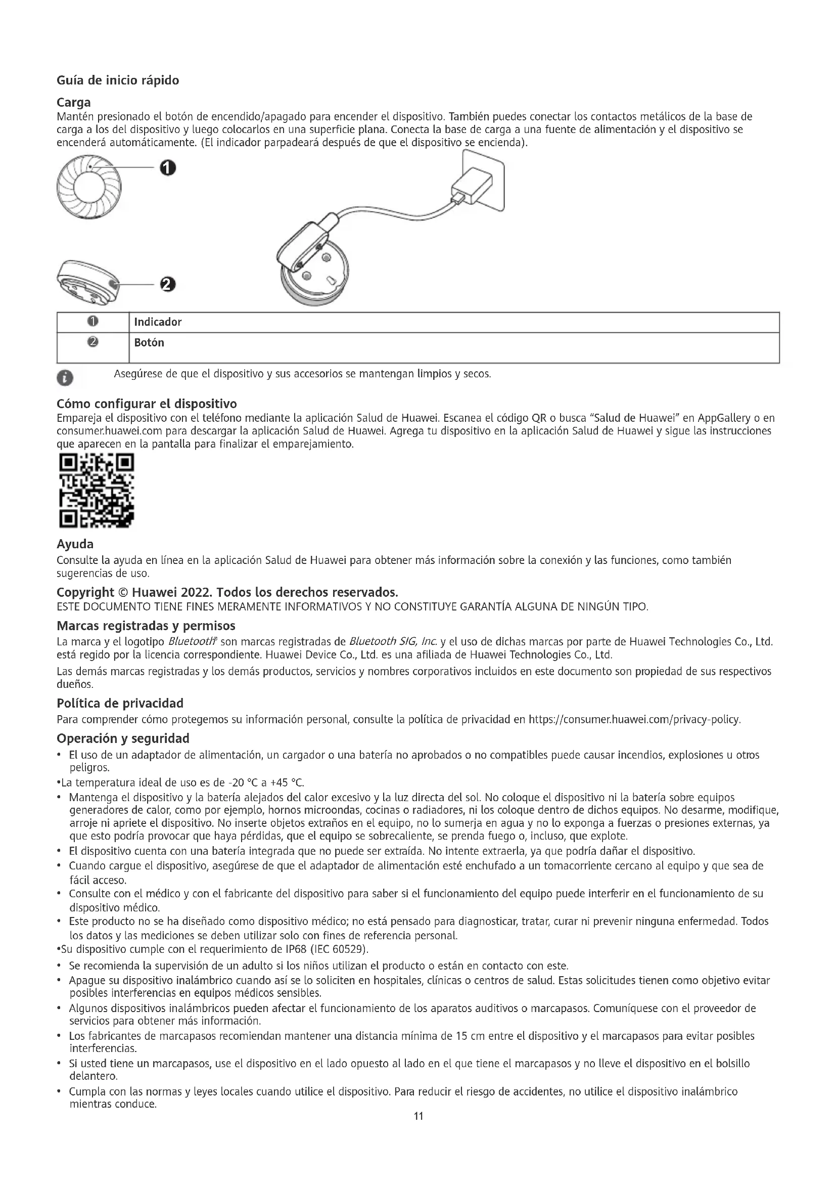 BotónAsegúrese de que el dispositivo y sus accesorios se mantengan limpios y secos. Cómo congurar el dispositivo Empareja el dispositivo con el teléfono mediante la aplicación Salud de Huawei. Escanea el código QR o busca “Salud de Huawei” en AppGallery o en consumer.huawei.com para descargar la aplicación Salud de Huawei. Agrega tu dispositivo en la aplicación Salud de Huawei y sigue las instrucciones que aparecen en la pantalla para nalizar el emparejamiento. Ayuda Consulte la ayuda en línea en la aplicación Salud de Huawei para obtener más información sobre la conexión y las funciones, como también sugerencias de uso. Copyright © Huawei 2022. Todos los derechos reservados. ESTE DOCUMENTO TIENE FINES MERAMENTE INFORMATIVOS Y NO CONSTITUYE GARANTÍA ALGUNA DE NINGÚN TIPO. Marcas registradas y permisos La marca y el logotipo Bluetooth