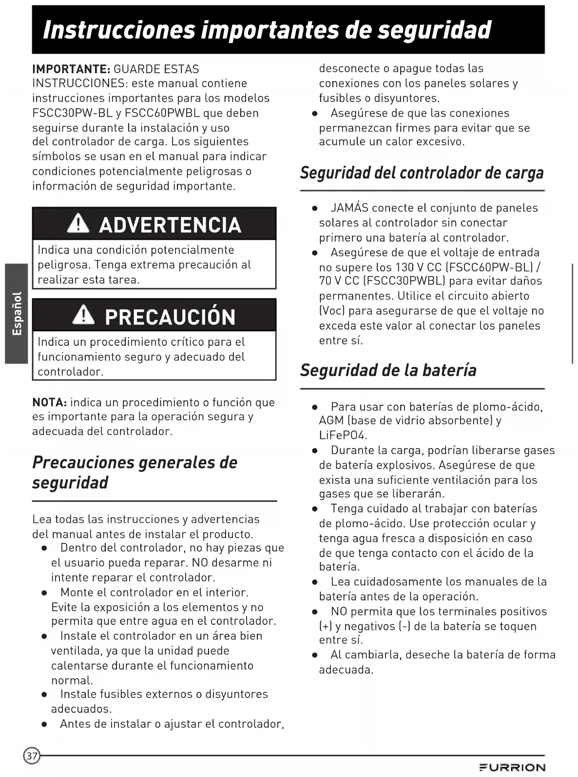 - controlador de carga solar MPPT. Antes de manejar un nuevo producto, lea las instrucciones detenidamente. Esto asegurará el uso sin riesgo y reducirá el riesgo de lesiones. Este manual de instrucciones contiene la información para la instalación, el mantenimiento del producto y el uso sin riesgos. Mantenga este manual de instrucciones en un lugar segura para que le sirva de referencia futura. Asegúrese de darle este manual a todos los nuevos propietarios de este producto. El fabricante no acepta la responsabilidad de ninguno de los daños por no seguir las instrucciones. Si tiene preguntas acerca de nuestros productos, comuníquese con: support@furrion.com Declaración de conformidad del proveedor 47 CFR § 2.1077 Información de cumplimiento Identificador único Nombre comercial: Furrion Modelo N.o: FSCC30PW-BL, FSCC60PW-BL Parte responsable – Información de contacto en EE. UU. Furrion Innovation Center & Institute of Technology 52567 Independence Ct., Elkhart, IN 46514, USA Línea gratuita:1-888-354-5792; Correo electrónico: support@furrion.com Declaración de cumplimiento con la Comisión Federal de Comunicaciones (FCC) Este dispositivo cumple con el Artículo 15 del Reglamento de la Comisión Federal de Comunicaciones (FCC). Su uso está sujeto a las siguientes dos condiciones: (1) Este dispositivo no debe causar interferencias perjudiciales, y (2) este dispositivo debe aceptar cualquier interferencia que reciba, incluidas las interferencias que puedan causar un funcionamiento no deseado.36 Contenido Español Bienvenido p. 35
