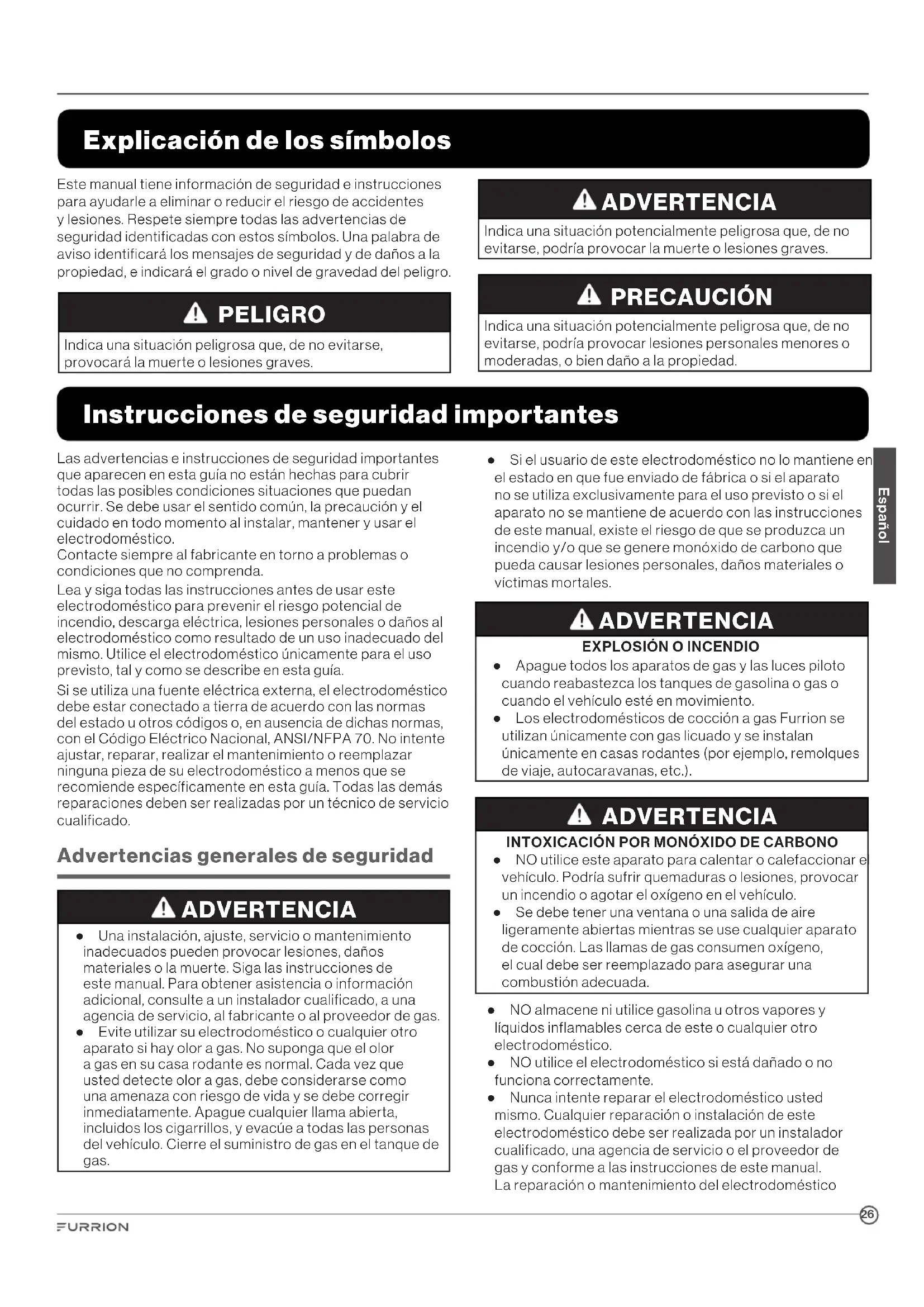 ● Apague todos los aparatos de gas y las luces piloto cuando reabastezca los tanques de gasolina o gas o cuando el vehículo esté en movimiento. ● Los electrodomésticos de cocción a gas Furrion se utilizan únicamente con gas licuado y se instalan únicamente en casas rodantes (por ejemplo, remolques de viaje, autocaravanas, etc.). ADVERTENCIA INTOXICACIÓN POR MONÓXIDO DE CARBONO ● NO utilice este aparato para calentar o calefaccionar el vehículo. Podría sufrir quemaduras o lesiones, provocar un incendio o agotar el oxígeno en el vehículo. ● Se debe tener una ventana o una salida de aire ligeramente abiertas mientras se use cualquier aparato de cocción. Las llamas de gas consumen oxígeno, el cual debe ser reemplazado para asegurar una combustión adecuada. ● NO almacene ni utilice gasolina u otros vapores y líquidos inflamables cerca de este o cualquier otro electrodoméstico. ● NO utilice el electrodoméstico si está dañado o no funciona correctamente. ● Nunca intente reparar el electrodoméstico usted mismo. Cualquier reparación o instalación de este electrodoméstico debe ser realizada por un instalador cualificado, una agencia de servicio o el proveedor de gas y conforme a las instrucciones de este manual. La reparación o mantenimiento del electrodoméstico Explicación de los símbolos Este manual tiene información de seguridad e instrucciones para ayudarle a eliminar o reducir el riesgo de accidentes y lesiones. Respete siempre todas las advertencias de seguridad identificadas con estos símbolos. Una palabra de aviso identificará los mensajes de seguridad y de daños a la propiedad, e indicará el grado o nivel de gravedad del peligro. PELIGRO Indica una situación peligrosa que, de no evitarse, provocará la muerte o lesiones graves. ADVERTENCIA Indica una situación potencialmente peligrosa que, de no evitarse, podría provocar la muerte o lesiones graves. PRECAUCIÓN Indica una situación potencialmente peligrosa que, de no evitarse, podría provocar lesiones personales menores o moderadas, o bien daño a la propiedad.27 Español por parte de una persona o agencia de servicio no autorizada podrían provocar una falla en la integridad del electrodoméstico y podría ocasionar daños materiales, lesiones graves o víctimas mortales. ● Solicite a su distribuidor que le muestre dónde se encuentra la válvula principal de cierre de gas y cómo cerrarla en caso de emergencia. ● Utilice el electrodoméstico únicamente para el uso previsto. ● Se debe enseñar a los niños que el electrodoméstico no es un juguete. No se les debe permitir jugar con los controles ni con ninguna otra parte del electrodoméstico. No permita que nadie se pare o se siente encima del electrodoméstico. Esto no sólo puede dañar el electrodoméstico, sino que también puede ocasionar lesiones personales. ● No guarde objetos de interés para los niños en armarios que estén encima o cerca del electrodoméstico. Si los niños se suben al electrodoméstico para alcanzar objetos pueden sufrir lesiones graves. ● Todas las perillas de control deben estar apagadas cuando no estén en uso. Puede haber peligro de incendio y/o sufrir quemaduras si se deja encendido accidentalmente un quemador. ● Si cualquier quemador se apagara (después del encendido inicial o debido a una extinción accidental de la llama), cierre todas las perillas de los quemadores y espere cinco (5) minutos antes de volver a intentar encender el quemador. ● NO guarde materiales inflamables sobre, dentro o cerca del electrodoméstico. Cualquier vapor o gas puede crear una explosión y/o peligro de incendio. ● No use ropa holgada o de manga larga mientras utilice el electrodoméstico. Si entran en contacto con la llama abierta del quemador, podrían encenderse y causar quemaduras graves. ● Utilice únicamente paños o guantes de cocina secos para quitar los utensilios calientes. El uso de paños o guantes de cocina húmedos en superficies calientes puede provocar quemaduras en las manos. No utilice una toalla o un paño voluminoso como guante de cocina. El paño podría entrar en contacto con la llama abierta y prenderse fuego. ● Nunca caliente un recipiente sin abrir. La acumulación de presión dentro del recipiente puede hacer que explote. ● No utilice agua para apagar incendios provocados por grasa o aceite. Nunca recoja un recipiente de cocción en llamas. Ahogue el fuego de un recipiente de cocción en llamas con una tapa u otro recipiente plano. La grasa en llamas fuera del recipiente de cocción se puede extinguir con bicarbonato de sodio o con un extintor de polvo químico seco multipropósito. ● Este electrodoméstico est diseñdo pr ser instldo en un estructur de rmrio únicmente y no est diseñdo pr ser instldo l estructur del edificio. Advertencias de seguridad del horno