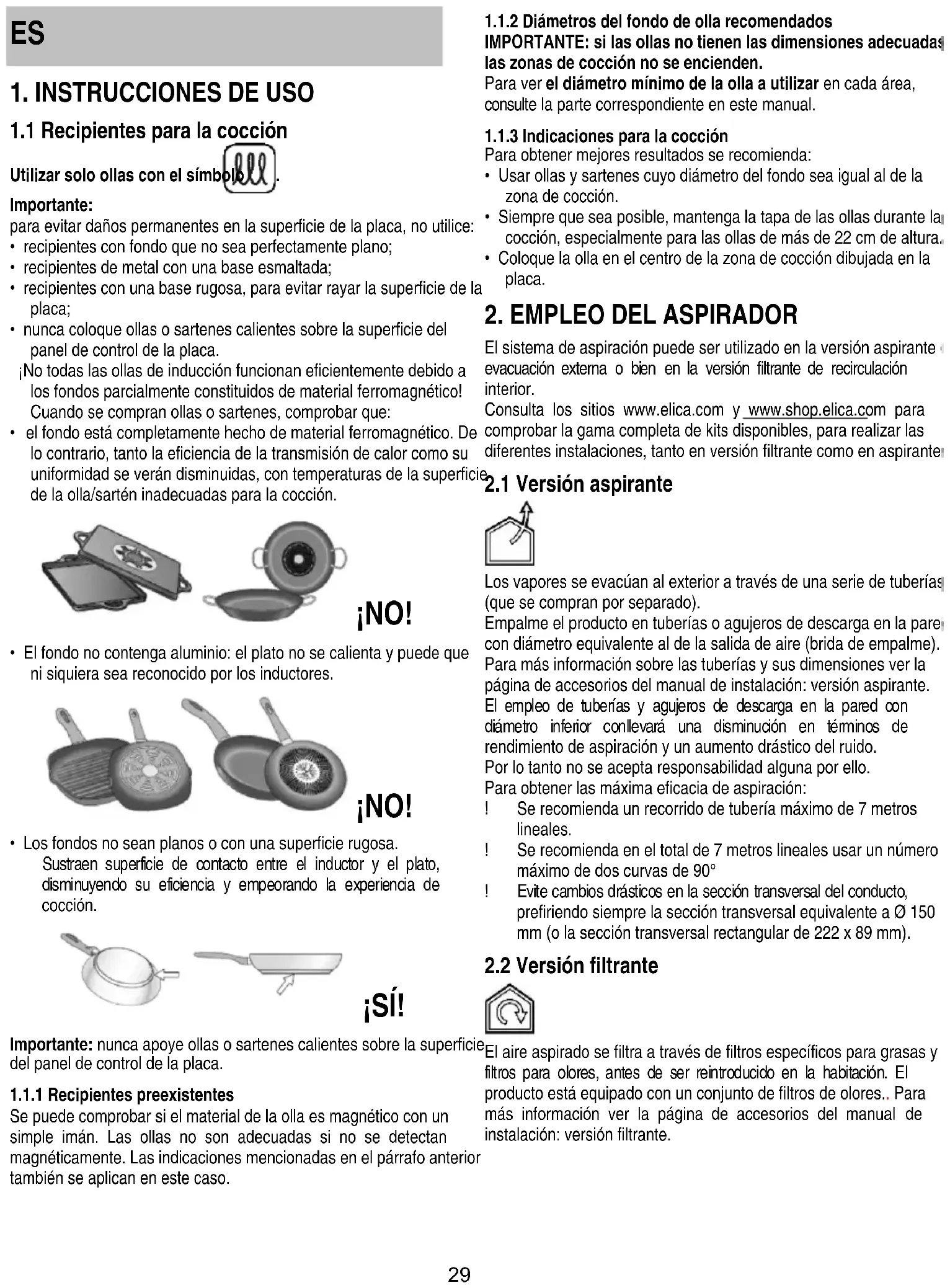 El sistema de aspiración puede ser utilizado en la versión aspirante de evacuación externa o bien en la versión filtrante de recirculación interior. Consulta los sitios www.elica.com y www.shop.elica.com para comprobar la gama completa de kits disponibles, para realizar las diferentes instalaciones, tanto en versión filtrante como en aspirante.